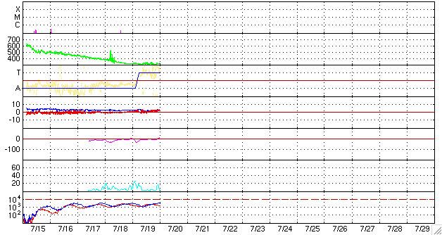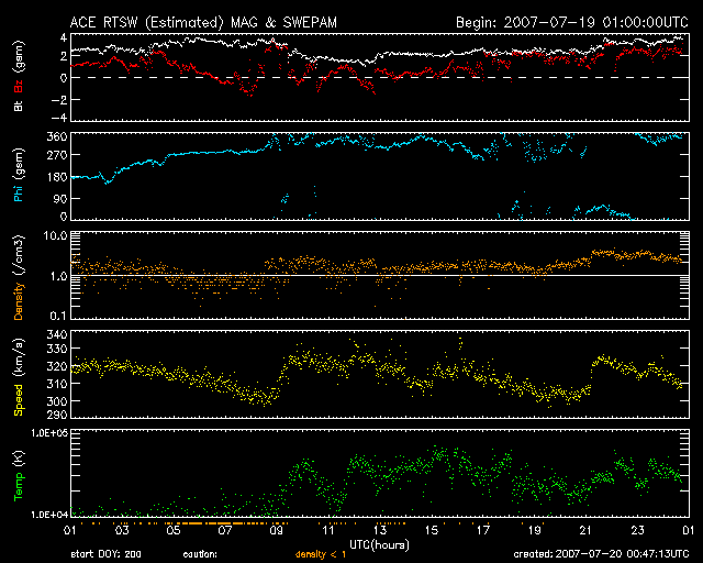 2007/ 7/20 09:48 更新 低速の太陽風が続いています。コロナホールの影響はまだ見られません。 担当 篠原 低速の太陽風が続いています。 昨日より、300〜320km/秒の低速風で安定しています。 コロナホールの影響はまだ見えていません。 27日周期の図によると、昨日、太陽風磁場のセクター境界がやってきました。 セクター境界とは、太陽風磁場の大まかな向きが切り替わる場所のことで、 昨日の場合、「太陽から地球向き(A)」だったのが、 「地球から太陽向き(T)」にひっくり返っています。 前周期の変化では、 セクター境界は6月21日に、高速風の始まりとともにやって来ました。 今周期は、速度の変化はまだ見られず、 セクター境界と高速風の位置関係も変わっている様です。 太陽風磁場の南北成分は、2nT程度の弱い振幅で北寄りに推移しています。 低速風であることもあり、磁気圏のオーロラ活動はとても静穏です。 シベリアの磁場データは平坦で、AE指数にも変化は記録されていません。 SOHO EIT284では、コロナホールは順調に太陽の西側へ移動しています。 影響がやってくるのかどうかは、このままACEのデータを見続けるしかありません。 今日、明日にかけて、変化がやって来るかどうかでしょう。 やって来た場合も、速度が大きく上がることはなさそうです。 太陽では、963黒点群が西に没しつつあります。 太陽はこのまま無黒点になりそうです。 SOHO衛星のEIT284カメラの映像 (c) SOHO (ESA & NASA)