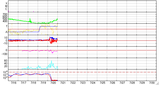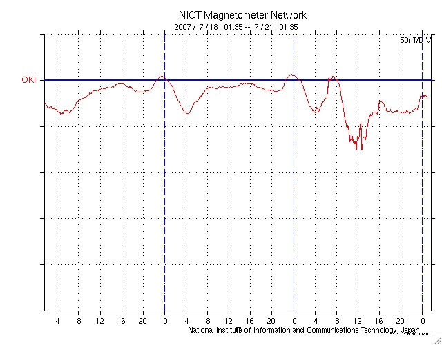 ACEが観測した太陽風の磁場(1番上の枠、白線は全体の強度、赤線は南北成分) および、太陽風の密度(3番目の橙線)、速度(4番目の黄線) (c) NOAA/SEC ![]() シベリアで観測された3日間の磁場データ 右側の3分の1が、昨日のデータになります。グラフが上がったり下がったりすると、オーロラ活動が活発化しています。 (c) NICT ![]() 沖縄の磁場擾乱 下へ下がるほど、擾乱が発達している事を意味します。 (c) NICT ![]() 27日の太陽周期に合わせたデータプロット 太陽が同じ面を地球に向けていた27日前の変化から、今後を予想することができます。 (c) NICT