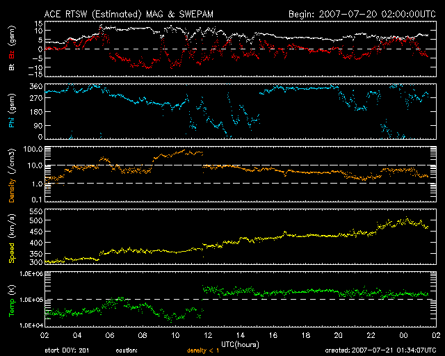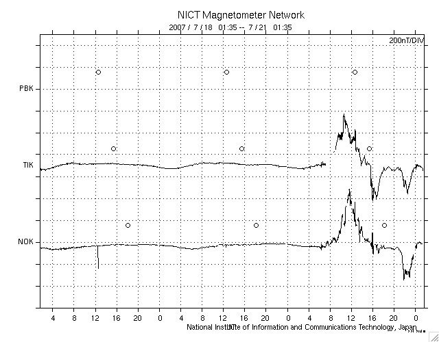 2007/ 7/21 10:35 更新 高速の太陽風がやって来ました(480km/秒)。南向き磁場の影響で、活発なオーロラ活動も発生しています。 担当 篠原 昨日のお昼くらいから、太陽風に乱れが発生しています。 ACE衛星の観測によると、 20日12時(世界時20日3時)から太陽風の磁場強度が強まり始め、 20日14時半(世界時20日5時半)に10nTに達しました。 それとともに、南北成分が大きく南を向く様になり、 -5nTから-10nTに達する規模で、10時間にわたって磁気圏への影響を強めました。 シベリアの磁場データでは、右側の1日分ほどで活発な変動が観測されています。 AE指数では、500〜900nTくらいの中規模のオーロラ活動が記録されています。 沖縄の磁場データを見ると、静穏レベルから-70nT近い磁場の減少を記録しています。 弱い磁気嵐状態になっていたようです。 ただし、変動の大きさを世界規模で調べると、 平均は-30nT程度で(Dst指数)、擾乱の規模は小さいものでした。 南向き磁場の変動としては、なかなかの規模だったのですが、 この頃はまだ太陽風の速度が400km/秒以下と遅く、 磁気圏へ流れ込むエネルギーの量がそれほど大きくはなりませんでした。 そのため、磁気圏の変動も比較的小さな規模にとどまったのです。 磁場強度の強まりによる磁気圏擾乱に続く様に、太陽風の速度が上昇を始めています。 現在、480km/秒付近で落ち着いています。 速度としては、普通の高速風というところでしょうか。 一方、磁場強度は既に下がり始めていて、5nTを前後しています。 このため、高速風は最高速の領域に達しつつあると思われます。 今後は、現状程度の太陽風が、明日にかけて続くのではないでしょうか。 SOHO EIT 284では、発生源のコロナホールは西へ去りつつあります。 この写真で太陽の東側(左側)に目をやると、 次のコロナホールが縦に細長く見えています。 明日くらいになると、もう少し見やすくなります。 5〜6日後くらいに、次はこちらの影響がやってくるでしょう。 放射線帯の高エネルギー電子は、磁気圏擾乱によって大きく数を減らしています。 今後、増加に転じると思われますが、高速風の規模から考えると、 大きな上昇はないだろうと思います。 963黒点群が沈んで、太陽は無黒点になりました。 フレア活動はとても静かです。 SOHO衛星のEIT284カメラの映像 (c) SOHO (ESA & NASA)