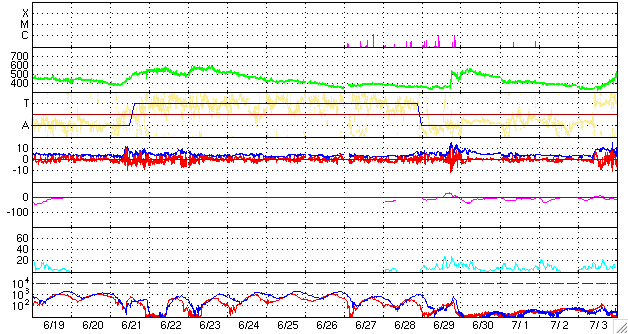 ACEが観測した太陽風の磁場(1番上の枠、白線は全体の強度、赤線は南北成分) および、太陽風の密度(3番目の橙線)、速度(4番目の黄線) (c) NOAA/SEC ![]() シベリアで観測された3日間の磁場データ 右側の3分の1が、昨日のデータになります。グラフが上がったり下がったりすると、オーロラ活動が活発化しています。 (c) NICT ![]() 27日の太陽周期に合わせたデータプロット 太陽が同じ面を地球に向けていた27日前の変化から、今後を予想することができます。 (c) NICT