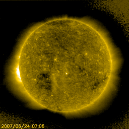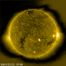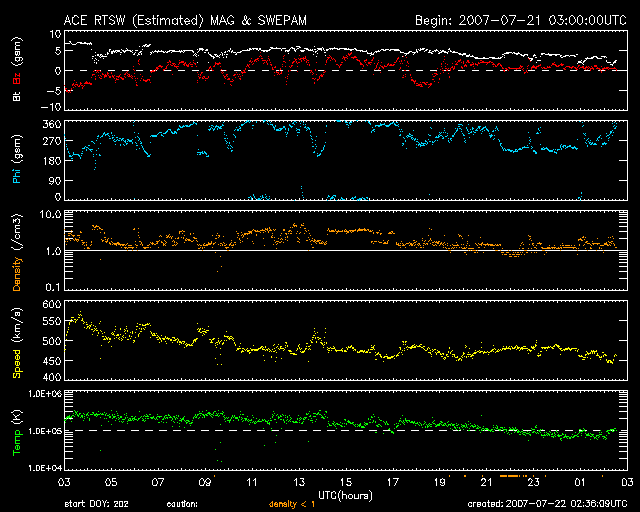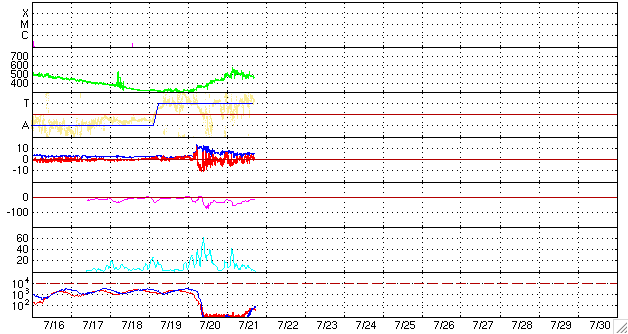 2007/ 7/22 11:37 更新 高速風が続いていますが、速度は低下傾向にあります(450km/秒)。次のコロナホールが見えています。 担当 篠原 昨日のニュースの後、太陽風の速度は一時的に550km/秒に上がりました。 その後、すぐに500km/秒に下がり、 それから現在まで、ゆっくりと低下の傾向にあります。 現在は、ちょうど450km/秒に戻ったところです。 高速風は、既に終盤を迎えています。 引き続き速度は下がり続け、明日には通常の状態にもどりそうです。 今回の高速風は、規模はだいぶ小さなものでした。 オーロラ活動は、最高速付近でやや活発な活動が見られました。 AE指数では、500nTから1000nTに達する中規模の変化が記録されています。 速度が下がり始めると活動は弱まり、小規模の変化にとどまる様になっています。 シベリアの磁場データでは、地方時の関係もあり、 後半の、規模が弱まった頃の変化の方が目立っています。 速度が下がっていますので、今後のオーロラ活動は、一段と穏やかになるでしょう。 SOHO EIT284では、次のコロナホールが太陽の中心へ向かって進んでいます。 7月21日の写真(左)と、27日前の6月24日の写真(右)を比較してください。 ほぼ同じ位置に、同じ様にコロナホールが広がっています。 このため、今回は、前周期と似た変化がやってくるのではないでしょうか。 27日周期の図では、高速風は6月29日に始まっています(この図は世界時です)。 これは、今周期では7月26日に相当します。 日本時間では、27日に入った頃になるかもしれません。 今度の高速風も、規模は小さく、期間は1日程度でした。 放射線帯の高エネルギー電子は、ほとんど増加をしていません。 今回は、大きく増加することはないでしょう。 太陽は無黒点となっています。 X線のレベルは低く、たいへん穏やかな太陽です。 SOHO衛星のEIT284カメラの映像 (c) SOHO (ESA & NASA)