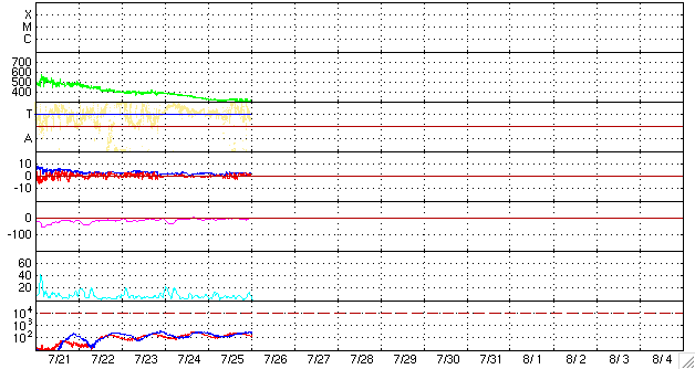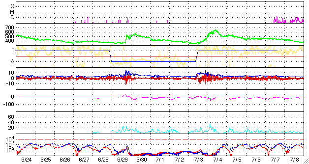 ACEが観測した太陽風の磁場(1番上の枠、白線は全体の強度、赤線は南北成分) および、太陽風の密度(3番目の橙線)、速度(4番目の黄線) (c) NOAA/SEC ![]() シベリアで観測された3日間の磁場データ 右側の3分の1が、昨日のデータになります。グラフが上がったり下がったりすると、オーロラ活動が活発化しています。 (c) NICT ![]() 27日の太陽周期に合わせたデータプロット 太陽が同じ面を地球に向けていた27日前の変化から、今後を予想することができます。 (c) NICT