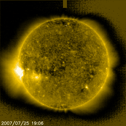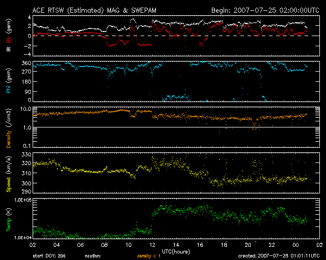 2007/ 7/26 10:01 更新 低速の太陽風が続き、磁気圏はとても穏やかです。これから高速風が始まると思われます。 担当 篠原 太陽風は、引き続き低速で穏やかな状態が続いています。 速度はもう一段下がって、300km/秒とかなり低速です。 磁場強度も、2nT前後と弱まったままです。 このため、磁気圏はたいへん静かです。 シベリア磁場データは、今日も平らなままです。 AE指数も変化は全く見られません。 とても静かな宇宙天気です。 この後、コロナホールの影響で、太陽風の乱れがやって来ると思われます。 発生源のコロナホールは、太陽の西にだいぶ進み、 SOHO EIT284の写真ではやや見にくくなっています。 言い替えると、地球に影響を及ぼす位置に達しているということになります。 前周期の変化から考えると、やってくる乱れは小規模です。 前回は、最高速が550km/秒程度、500km/秒を超えたのは1日程度でした。 今回の高速風の規模も、それほど変わらないのではないでしょうか。 やってくるのは、今日の夜か、明日に入ってではないかと思われます。 また、今日の写真ではかえって分かりにくくなっていますが(昨日の方が見やすそうです)、 太陽の中心付近には次のコロナホールが来ています。 こちらの影響も、3-4日後くらいに始まりそうです。 太陽は無黒点のままです。 SOHO EIT284の東の端に見えていた明るい領域は、既にこちら側に回って来ている様です。 とすると、この領域には黒点は無かったようです。 フレア活動は全く無く、静かな太陽です。 SOHO衛星のEIT284カメラの映像 (c) SOHO (ESA & NASA)