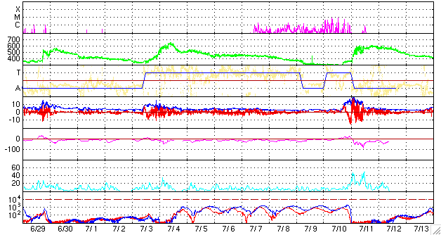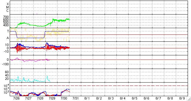 ACEが観測した太陽風の磁場(1番上の枠、白線は全体の強度、赤線は南北成分) および、太陽風の密度(3番目の橙線)、速度(4番目の黄線) (c) NOAA/SEC ![]() シベリアで観測された3日間の磁場データ 右側の3分の1が、昨日のデータになります。グラフが上がったり下がったりすると、オーロラ活動が活発化しています。 (c) NICT ![]() 27日の太陽周期に合わせたデータプロット 太陽が同じ面を地球に向けていた27日前の変化から、今後を予想することができます。 (c) NICT