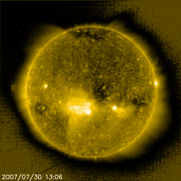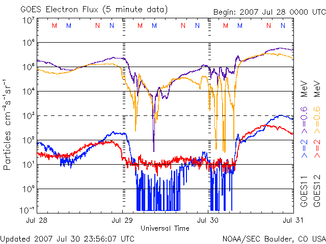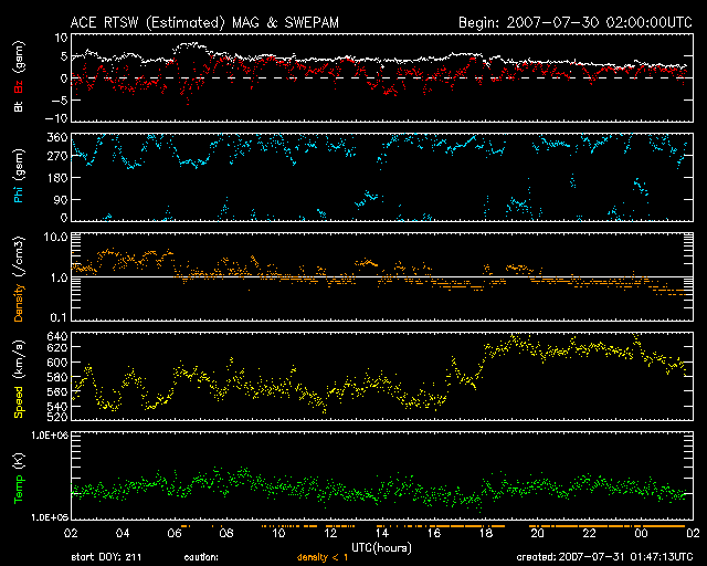 2007/ 7/31 10:47 更新 高速の太陽風が続いています(600km/秒)。放射線帯の高エネルギー電子が増加しつつあります。 担当 篠原 高速の太陽風が続いています。 昨日より、550km/秒前後の速度が続いていましたが、 今日に入った頃から一段上がって、600km/秒と高い状態になっています。 一方、太陽風の磁場強度は、5nTから3nTへ弱まっています。 このことから、速度の上昇はこれで一段落ついたと思われます。 高速風の影響で、500-800nTの中規模のオーロラ活動が続いています。 速度としては、今日に入ってからの方が高まっていますが、 それとともに磁場強度が下がり、かつ南北成分が北寄りになっているため、 オーロラ活動としては、むしろ今日に入った頃から弱まりを見せています。 現在も、速度としては高い状態が続いているので、 磁場が南寄りに変わると、再びオーロラも活発化するでしょう。 SOHO EIT284の太陽写真を見ると、 コロナホールの最後尾(左端)が、太陽の中心を通過しつつあります。 このことから、高速風の影響は今日を含めて3-4日程度続くのではないかと予想されます。 8月3日くらいから下がり始めるのではないでしょうか。 前周期と比べると、立派な高速風領域になりそうです。 高速太陽風の影響で、放射線帯の高エネルギー電子が増加を始めています。 現在は、1000に達した程度で、まだ警戒レベルではありません。 引き続き上昇すると思われますので、今後の変化に注意してください。 太陽では、965黒点群が、掲載の写真では見つけることができなくなっています。 このまま消えて、無黒点になっていきそうです。 X線のグラフも、とても穏やかです。 SOHO衛星のEIT284カメラの映像 (c) SOHO (ESA & NASA)