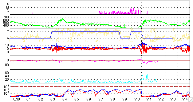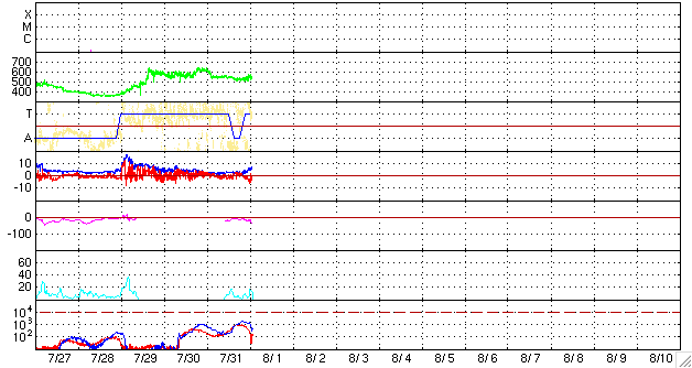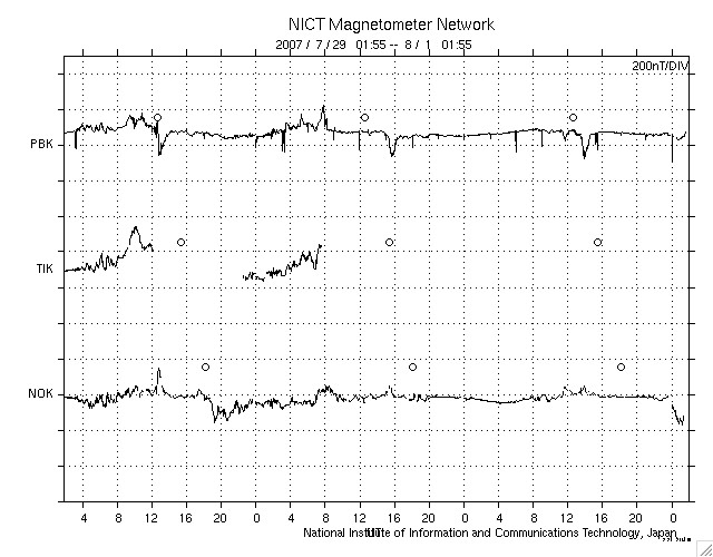 ACEが観測した太陽風の磁場(1番上の枠、白線は全体の強度、赤線は南北成分) および、太陽風の密度(3番目の橙線)、速度(4番目の黄線) (c) NOAA/SEC ![]() シベリアで観測された3日間の磁場データ 右側の3分の1が、昨日のデータになります。グラフが上がったり下がったりすると、オーロラ活動が活発化しています。 (c) NICT ![]() 27日の太陽周期に合わせたデータプロット 太陽が同じ面を地球に向けていた27日前の変化から、今後を予想することができます。 (c) NICT