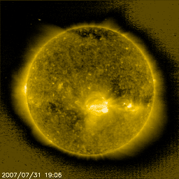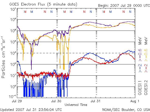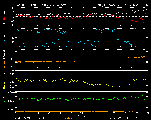 2007/ 8/ 1 10:52 更新 高速の太陽風が続いています(540km/秒)。これから、再上昇するかもしれません。 担当 篠原 速度540km/秒前後の、高速の太陽風が続いています。 昨日のニュースの頃は、速度が600km/秒に上がっていた太陽風ですが、 その後、すぐに540km/秒に下がり、そのまま現在まで続いています。 磁場強度も、3nT程度と弱めの状態が続いていました。 速度は高いのですが、磁場が弱まってしまったこともあり、 オーロラ活動は小さくなっています。 AE指数では500nT弱の変化がひとかたまり見えている程度です。 ACEの図の右端、最新の部分を見ると、 今朝、8月1日5時(世界時7月31日20時)頃から、磁場強度が次第に強まっています。 現在は8nTくらいに上がっています。 大きな変化ではありませんが、これから、速度が再上昇するのかもしれません。 今回の高速風の発生源となるコロナホールは、 小さめのコロナホールが3つほど、横方向に並んだ様な姿をしていました (7月29日のニュースのEIT284の写真を見てください)。 このため、太陽風の速度が上がったり下がったりと、細かく変化するのかもしれません。 高速風としては、3日後くらいまで続きそうです。 磁場強度が上がって来ているので、南向き成分が大きくなって、 中規模程度のオーロラ活動が現れるようになる可能性があります。 放射線帯の高エネルギー電子は、昨日のレベルから目立った変化をしていません。 この後、太陽風の速度が再上昇すると、 その影響で、こちらも一旦大きく減少するかもしれません。 高速風の期間中は、変化に注意してください。 太陽面では、965黒点群がたいへん小さくなっていますが、 まだかろうじて残っているようです。 X線のグラフはとても静かで、穏やかな太陽が続いています。 SOHO衛星のEIT284カメラの映像 (c) SOHO (ESA & NASA)