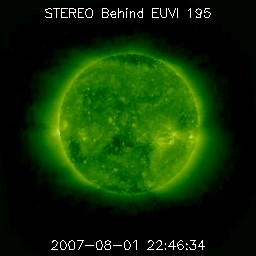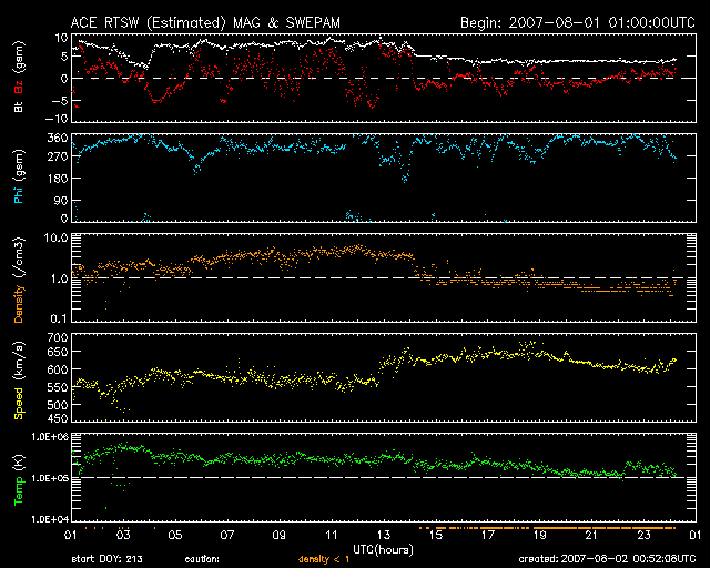2007/ 8/ 2 09:53 更新 太陽風の速度は再び上昇し、600km/秒を超えています。オーロラも活動的になっています。 担当 篠原 昨日のニュースの後、太陽風の磁場が8nTに強まった状態が半日ほど続きました。 掲載しているACEの図の前半部分です。 それとともに、速度もやや上がる傾向を示し、 1日22時(世界時0日13時)には600km/秒を超えました。 その後も、600〜650km/秒の高速状態が続いています。 27日周期の図を見てください。 7月29日に続いて8月1日と、2つ速度・磁場強度の山ができています。 磁場強度が強まったことで、強い南向きの磁場も頻繁に現れるようになりました。 このため、AE指数で500〜1000nTの、中規模のオーロラ活動が発生しています。 シベリア磁場データも、活発な変化を示しています。 しかし、速度が600km/秒に回復すると、磁場強度は4nTに弱まってしまいました。 このため、南北成分の変化も小幅になり、 速度は上がったのですが、オーロラ活動はややおとなしくなっています。 コロナホールの様子から、高速風は明後日くらいまで続くと思われます。 オーロラ活動ももうしばらく続きそうです。 この後、速度はゆっくりと下がって行くのか、もうひと山見られるのか、 引き続き、太陽風の変化に注目してください。 放射線帯の高エネルギー電子は、引き続き上昇しています。 まだ、警戒レベル以下ですが、今日の高速風がどのような影響を及ぼすのか注目されます。 明日以降のデータに注意してください。 太陽は黒点が消えてしまい、無黒点になっています。 穏やかな状態です。 STEREO衛星紫外線望遠鏡EUVI195の太陽写真。8月2日8時(世界時8月1日23時) (c) NASA ![]() ACEが観測した太陽風の磁場(1番上の枠、白線は全体の強度、赤線は南北成分) および、太陽風の密度(3番目の橙線)、速度(4番目の黄線) (c) NOAA/SEC ![]() シベリアで観測された3日間の磁場データ 右側の3分の1が、昨日のデータになります。グラフが上がったり下がったりすると、オーロラ活動が活発化しています。 (c) NICT ![]() 27日の太陽周期に合わせたデータプロット 太陽が同じ面を地球に向けていた27日前の変化から、今後を予想することができます。 (c) NICT