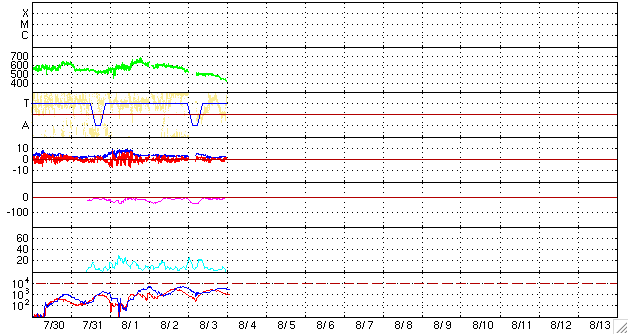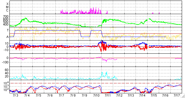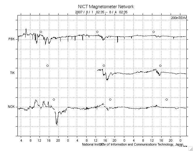 ACEが観測した太陽風の磁場(1番上の枠、白線は全体の強度、赤線は南北成分) および、太陽風の密度(3番目の橙線)、速度(4番目の黄線) (c) NOAA/SEC ![]() シベリアで観測された3日間の磁場データ 右側の3分の1が、昨日のデータになります。グラフが上がったり下がったりすると、オーロラ活動が活発化しています。 (c) NICT ![]() 27日の太陽周期に合わせたデータプロット 太陽が同じ面を地球に向けていた27日前の変化から、今後を予想することができます。 (c) NICT