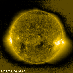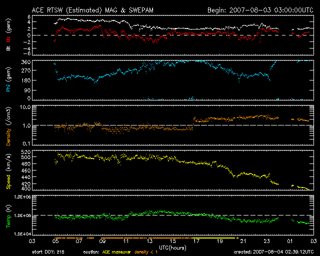 2007/ 8/ 4 11:40 更新 太陽風の速度は下がり(400km/秒)、穏やかになっています。 担当 篠原 地球は高速の太陽風領域を抜け出しました。 4日0時(世界時3日15時)頃から速度はすっと下がり、 太陽風は現在、速度400km/秒と通常の状態に戻っています。 今日掲載している27日周期の図では、 高速風の始まりの部分が既に欠けてしまいましたが、 今回の高速風は7月29日に始まり、 500km/秒以上が5日間にわたって続く規模となりました。 磁気圏の活動は、概ね穏やかな状態が続いています。 シベリアの磁場データのグラフも、変化が見られなくなっています。 太陽風の速度が下がりましたので、この後も静穏なままでしょう。 SOHO EIT284の太陽写真では、 コロナホールが南半球で東西に長く広がっています。 その右端は、既に太陽の中心と西の端の中間付近に達しており、 地球へ影響が及び始めてもよい位置に見えています。 コロナホールは途切れながらも、東側にかけて横に長く分布しています。 続いてやってくる高速風も、期間の長いものになりそうです。 放射線帯高エネルギー電子は増加が止まり、落ち着いています。 今回の高速風では、警戒レベルまでは上がりませんでした。 太陽では、東の端から966黒点群が上がってきました。 掲載している写真では、まだ見えていない様です。 小さな黒点群で、太陽のフレア活動は穏やかなままです。 SOHO衛星のEIT284カメラの映像 (c) SOHO (ESA & NASA)