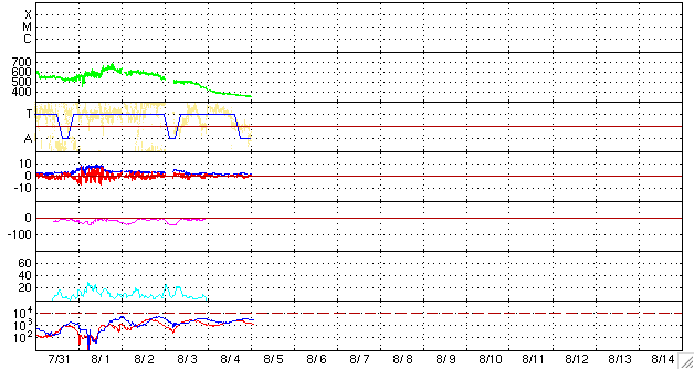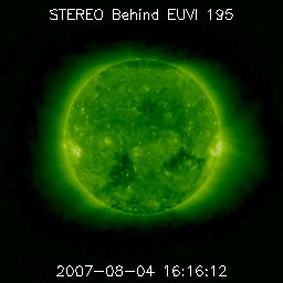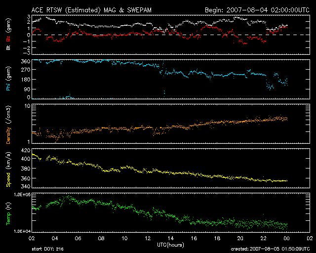 2007/ 8/ 5 10:50 更新 太陽風は低速になっています(350km/秒)。やがて次の高速風がやって来るでしょう。 担当 篠原 太陽風は、速度が400km/秒から350km/秒に下がり、低速風になっています。 磁場強度も1〜2nTとたいへん弱く、とても穏やかな状態です。 このため、磁気圏もたいへん静穏で、 シベリアの磁場データは、完全に平坦になっています。 今日の太陽コロナの写真は、STEREO衛星の画像を掲載しています。 太陽の南半球側に、コロナホールが右と左に大きくふたつ見えています。 このうちの右側のコロナホールの影響が、これから地球へやって来ると思われます。 27日周期の図では、前回の高速風は7月11日に来ています。 このまま27日で予想すると、次の到来は8月7日になりますが、 現在のコロナホールの様子では、到来はもっと早まりそうです。 高速風がやってくる前には、磁場強度の増加が見られます。 この後の太陽風の磁場強度にも注目してください。 コロナホールが東西に並んで広がっていることから、 太陽風の乱れは、上下しながら1週間程度続くのではないかと思います。 放射線帯高エネルギー電子は、昨日同様、やや高めのレベルで落ち着いています。 以後は、ゆっくりと減少していくでしょう。 太陽写真の東端(左端)で、966黒点群が小さな姿を見せています。 フレア活動は無く、太陽は穏やかです。 STEREO衛星紫外線望遠鏡EUVI195の太陽写真。5日1時(世界時4日16時) (c) NASA ![]() ACEが観測した太陽風の磁場(1番上の枠、白線は全体の強度、赤線は南北成分) および、太陽風の密度(3番目の橙線)、速度(4番目の黄線) (c) NOAA/SEC ![]() シベリアで観測された3日間の磁場データ 右側の3分の1が、昨日のデータになります。グラフが上がったり下がったりすると、オーロラ活動が活発化しています。 (c) NICT ![]() 27日の太陽周期に合わせたデータプロット 太陽が同じ面を地球に向けていた27日前の変化から、今後を予想することができます。 (c) NICT