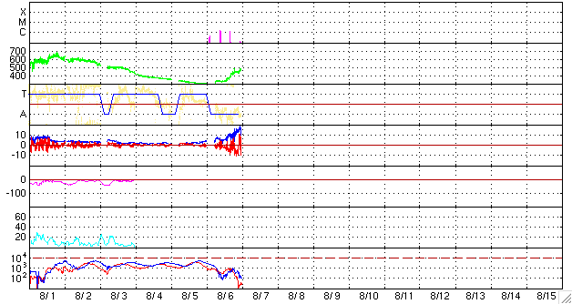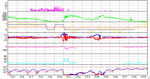 ACEが観測した太陽風の磁場(1番上の枠、白線は全体の強度、赤線は南北成分) および、太陽風の密度(3番目の橙線)、速度(4番目の黄線) (c) NOAA/SEC ![]() シベリアで観測された3日間の磁場データ 右側の3分の1が、昨日のデータになります。グラフが上がったり下がったりすると、オーロラ活動が活発化しています。 (c) NICT ![]() 27日の太陽周期に合わせたデータプロット 太陽が同じ面を地球に向けていた27日前の変化から、今後を予想することができます。 (c) NICT