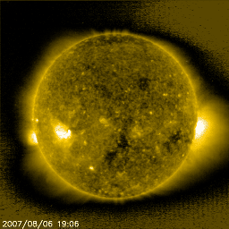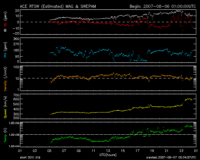 2007/ 8/ 7 09:35 更新 高速太陽風が始まりました(600km/秒)。オーロラも活発に発生しています。 担当 篠原 太陽風の速度が上昇し、高速風が始まりました。 現在の速度は600km/秒で、引き続き上昇する可能性があります。 ACE衛星の観測によると、 昨夜、6日22時(世界時6日13時)頃から磁場強度が上昇を始めました。 それまでの5nTから、今朝、7日8時(世界時6日23時)には、 20nT近くにまで上昇しています。 そこでがくんと下がって、現在は10nTです。 それでも、まだ強まった状態です。 磁場強度が強まるとともに、太陽風の速度もゆっくりと上昇を始めたのですが、 磁場強度が最大に達したところで、一気に600km/秒に上がりました。 かなり高い速度ですが、磁場強度がまだ強まったままであることから、 もう一段上昇する可能性があります。 27日周期の図を見ると、高速風の始まりは前周期とそれほど変わりませんでした。 磁場強度の強まり具合もよく似ています。 SOHO EIT284の太陽写真を見ると、 最後尾のコロナホールがちょうど太陽の中心を通過しています。 これから1週間近くに渡って、太陽風は乱れた状態が続くでしょう。 太陽風の乱れが始まって、磁気圏活動も活発化しています。 磁場強度が強まるとともに、-5〜-7nT程度の強めの南向き磁場が続きました。 このため、AE指数では500nTから1000nTの中規模のオーロラ活動が観測されています。 シベリアの磁場データも活発に変化しています。 現在、速度が高まった上に、磁場強度も強まった状態が続いています。 太陽風磁場が南を向くことによって、活発な磁気圏擾乱が発生するでしょう。 放射線帯の高エネルギー電子は、減少の傾向にあります。 高速風が一段落着く頃から上昇に転じる可能性がありますので、 今後の変化に注目してください。 太陽では、966黒点群がC1の小規模フレアを2回起こしています。 黒点群の規模は特に変化がなく、今のところ活発な活動には繋がりそうにありません。 基本的に太陽は穏やかな状態を保ちそうです。 SOHO衛星のEIT284カメラの映像 (c) SOHO (ESA & NASA)