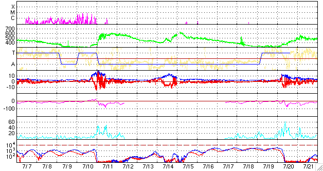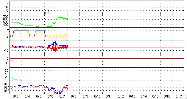 ACEが観測した太陽風の磁場(1番上の枠、白線は全体の強度、赤線は南北成分) および、太陽風の密度(3番目の橙線)、速度(4番目の黄線) (c) NOAA/SEC ![]() シベリアで観測された3日間の磁場データ 右側の3分の1が、昨日のデータになります。グラフが上がったり下がったりすると、オーロラ活動が活発化しています。 (c) NICT ![]() 27日の太陽周期に合わせたデータプロット 太陽が同じ面を地球に向けていた27日前の変化から、今後を予想することができます。 (c) NICT