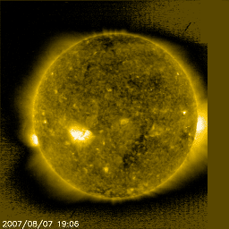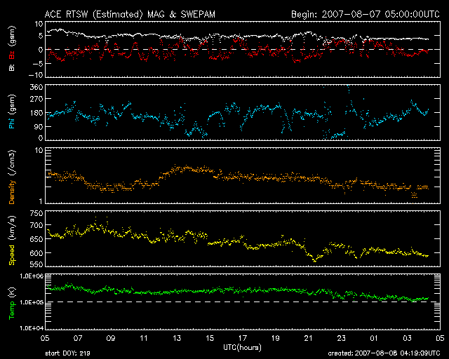 2007/ 8/ 8 13:20 更新 600km/秒台の高速太陽風が続いています。オーロラ活動も活発です。 担当 篠原 600km/秒台の高速風が続いています。 昨日のニュースの頃に、太陽風はちょうど600km/秒へ達したのですが、 その後もゆっくりと上昇して、 7日17時(世界時7日8時)頃に、700km/秒にまで上がりました。 ただし、そこが最高点だった様で、 速度はそこから下がる方向に変わり、現在は600km/秒まで戻っています。 速度がかなり上がったことで、磁気圏のオーロラ活動も活発になっています。 AE指数では、500nTから1000nTの中規模の活動が一日にわたって見られました。 その変化は、シベリア磁場データでも観測されています。 太陽風磁場の南北成分を見ると、 振幅はそれほど大きくありませんが、南北をまたぐように変化が続き、 -3nTくらいの南向きがよく見られています。 オーロラが活発だったのは、この影響も大きいでしょう。 もしここで、南向きの振幅が-5nTなど、更に大きかった場合は、 一層激しいオーロラ活動が起こっていたと思われます。 太陽風の速度は、かなり高い状態です。 今後も、オーロラ活動が活発に続く可能性があります。 ただし、速度は低下の傾向にあることと、磁場強度が弱まって来ていますので、 オーロラ活動の規模自体は次第に小さくなって行くでしょう。 SOHO EIT284の太陽写真では、コロナホールが太陽の中心を過ぎています。 現在の高速風が一段落着く頃に、次はこちらのコロナホールの影響が始まるでしょう。 来週の初めくらいまで、太陽風は比較的乱れた状態が続くと思われます。 放射線帯の高エネルギー電子が増加を始めています。 青線のGOES11は、4,000のレベルに達しています。 明日には警戒ラインである10,000に到達するかもしれません。 今後の高エネルギー電子の変化に注意してください。 小さなCクラスフレアを起こした966黒点群ですが、その後は落ち着いています。 太陽は穏やかです。 SOHO衛星のEIT284カメラの映像 (c) SOHO (ESA & NASA)