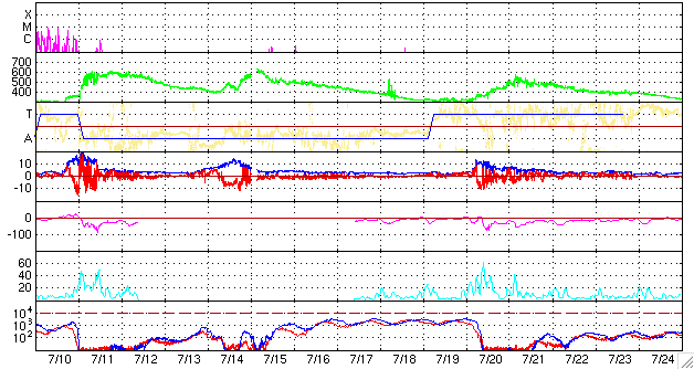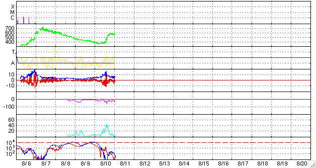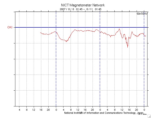 ACEが観測した太陽風の磁場(1番上の枠、白線は全体の強度、赤線は南北成分) および、太陽風の密度(3番目の橙線)、速度(4番目の黄線) (c) NOAA/SEC ![]() シベリアで観測された3日間の磁場データ 右側の3分の1が、昨日のデータになります。グラフが上がったり下がったりすると、オーロラ活動が活発化しています。 (c) NICT ![]() 沖縄の磁場擾乱 下へ下がるほど、擾乱が発達している事を意味します。 (c) NICT ![]() 27日の太陽周期に合わせたデータプロット 太陽が同じ面を地球に向けていた27日前の変化から、今後を予想することができます。 (c) NICT