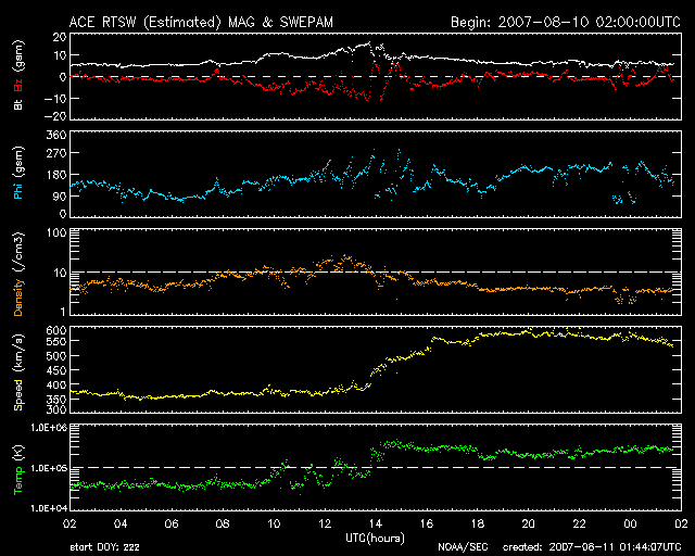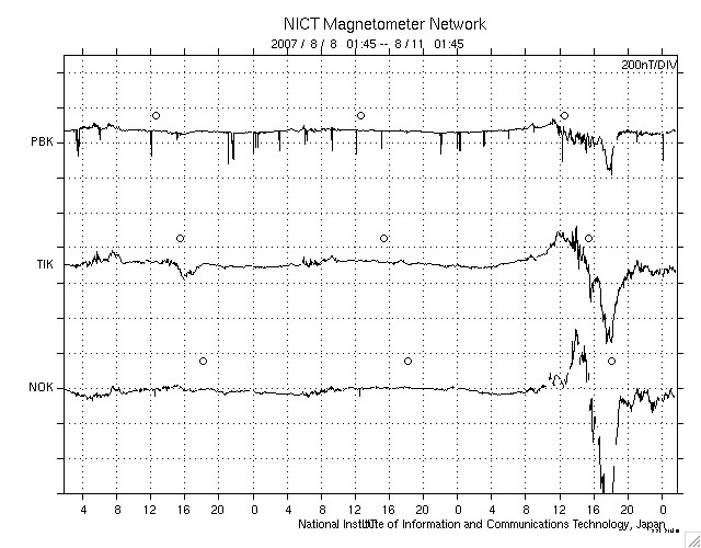 2007/ 8/11 10:45 更新 高速の太陽風がやって来ました(550km/秒)。オーロラも活発に活動しています。 担当 篠原 高速の太陽風がやって来ました。現在の速度は550km/秒です。 10日17時(世界時10日8時)頃から、太陽風の磁場強度が本格的に上がり始めました。 それまでの5nTから、6時間後の10日23時(世界時10日14時)には、15nTにまで強まりました。 そして、ちょうどその頃から速度が上昇を始め、 400km/秒から、4時間ほどで570km/秒にまで上がりました。 この後、速度の変化は止まり、550km/秒の高速風が7時間続いています。 速度が上がり始めるとともに、磁場強度は弱まって行き、5nTに戻りました。 このことから、高速風は既に最高速度の状態になっていると思われます。 太陽風磁場が強まった時に、南北成分がかなり南に偏った状態になりました。 -5nTから、最大で-10nTに達する南向きが、8時間近く続いています。 この影響で、オーロラ活動が活発化しました。 速度が高まる前だったので、規模自体は中規模に留まっていますが、 AE指数で500〜1000nTの変動が半日に渡って続いています。 シベリアの磁場データも、右側のところで急に大きな活動を記録しています。 プラス側に大きく上がっているのも、マイナス側に大きく下がっているのも、 それぞれオーロラ電流の影響です。 観測点の上空を流れた電流が、 東を向いていたか、西を向いていたかの違いによるものです。 オーロラ活動の影響は、沖縄の磁場も乱しています。 10日21時〜11日3時(世界時10日12-18時)に見える細かい上下動は、 磁気圏が乱れたために発生した変化です。 27日周期の図を見てください。 前周期と同様のタイミングで太陽風の変化がやって来ました。 太陽風磁場の南向きが強まるという傾向も良く似ています。 今後も、前回と同様の経過をたどると考えると、速度が高いのも今日までで、 明日以降はゆっくりと通常の速度へと戻って行くでしょう。 磁場強度が弱まって来ているので、 今後のオーロラ活動は規模が小さくなって行くと思われます。 放射線帯の高エネルギー電子は、今回の磁気圏変動の影響で、 一気に数を減らしています。 この後、高速風の影響で再び増加すると思われますが、 高速風の規模から考えると、大きく増加することはないだろうと思います。 太陽のフレア活動は穏やかです。 966黒点群が次第に西へ移動しています。 SOHO衛星のEIT284カメラの映像 (c) SOHO (ESA & NASA)