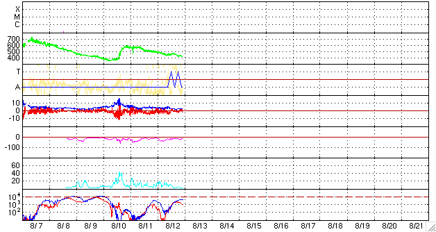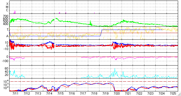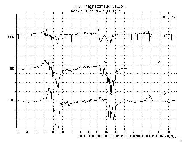 ACEが観測した太陽風の磁場(1番上の枠、白線は全体の強度、赤線は南北成分) および、太陽風の密度(3番目の橙線)、速度(4番目の黄線) (c) NOAA/SEC ![]() シベリアで観測された3日間の磁場データ 右側の3分の1が、昨日のデータになります。グラフが上がったり下がったりすると、オーロラ活動が活発化しています。 (c) NICT ![]() 27日の太陽周期に合わせたデータプロット 太陽が同じ面を地球に向けていた27日前の変化から、今後を予想することができます。 (c) NICT
