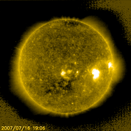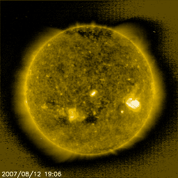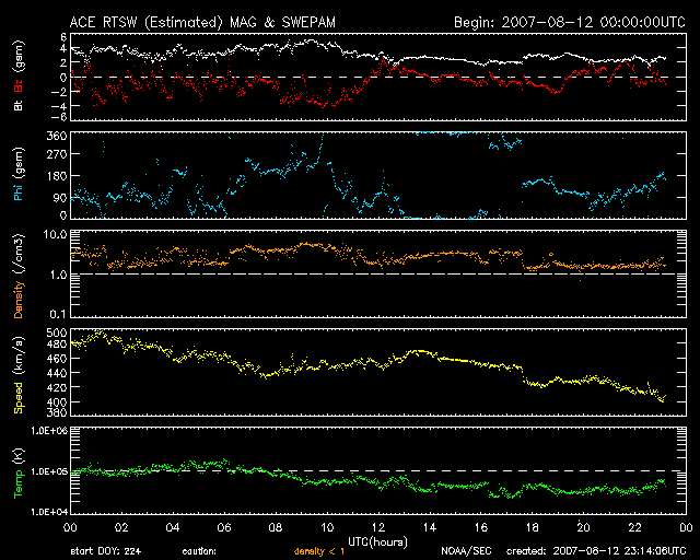 2007/ 8/13 08:15 更新 太陽風は通常の状態に戻っています。磁気圏も静穏です。 担当 篠原 太陽風は引き続きゆっくりと速度を下げ続け、400km/秒になりました。 高速風は終わり、通常の太陽風に戻りました。 磁場強度も、4nTから2nTへと弱まっています。 27日周期の図を見ると、今回の高速風も、前周期とほぼ同じ経過をたどりました。 速度が下がって来たため、磁気圏の活動も概ね穏やかになっています。 12日19時(世界時12日10時)付近で、太陽風の磁場が-4nT程度南を向き続け、 小規模のオーロラ活動が発生しています。 しかし、目立った変化はこの程度です。 速度も磁場強度も弱まったことで、 磁気圏は、今後は一段と穏やかになるでしょう。 SOHO EIT284の太陽写真では、 次のコロナホールが、太陽の中心から南寄り(下寄り)に見えています。 27日前(7月16日)の、前周期の写真と比較してください。 コロナホールは、前回よりも一段と縮こまってしまった様です。 27日周期の図で太陽風の変化を見ると、 前周期の高速風(7月20-22日)も、最高速度が500km/秒程度で、 規模の小さいものでした。 今回、コロナホールが弱まったことで、 やって来る高速風はもう一段弱まったものになるかもしれません。 3日後の16日くらいから影響が見られるでしょう。 放射線帯の高エネルギー電子の増加はほとんど止まっています。 やや高めのレベルですが、今回は、警戒ラインには達しそうにありません。 太陽のフレア活動はとても穏やかです。 966黒点群は規模が小さくなり、掲載の写真では見つけることができなくなりました。 今日から来週の22日まで、観測のためにカムチャッカ半島へ出かけます。 その間、更新をお休みしたり、更新する時刻が遅くなると思います。 申し訳ありませんが、しばらくの間ご了承ください。 SOHO衛星のEIT284カメラの映像 (c) SOHO (ESA & NASA)