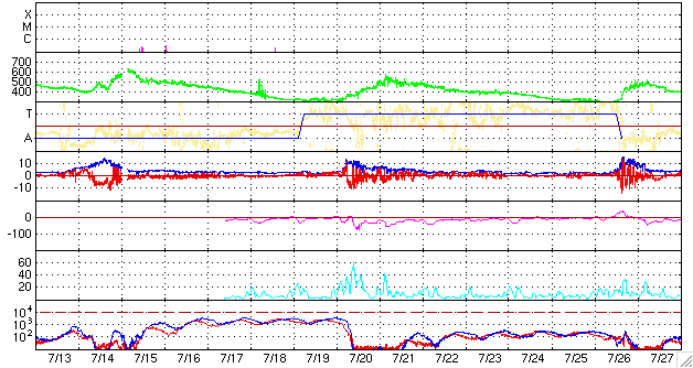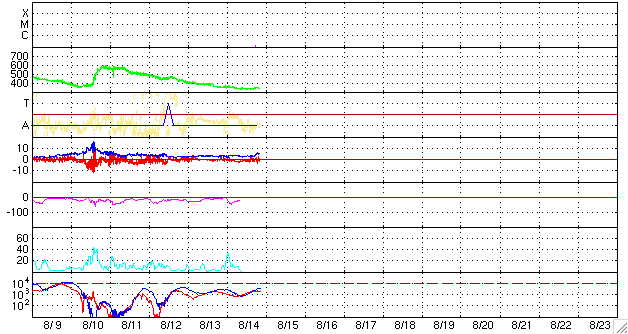 ACEが観測した太陽風の磁場(1番上の枠、白線は全体の強度、赤線は南北成分) および、太陽風の密度(3番目の橙線)、速度(4番目の黄線) (c) NOAA/SEC ![]() シベリアで観測された3日間の磁場データ 右側の3分の1が、昨日のデータになります。グラフが上がったり下がったりすると、オーロラ活動が活発化しています。 (c) NICT ![]() 27日の太陽周期に合わせたデータプロット 太陽が同じ面を地球に向けていた27日前の変化から、今後を予想することができます。 (c) NICT