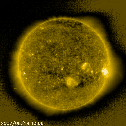 2007/ 8/15 10:35 更新 太陽風は低速で、磁気圏は穏やかです。 担当 篠原 昨日は記事の更新ができず、申し訳ありませんでした。 1日飛んでしまいましたが、その間、太陽風は穏やかでした。 速度は更に下がって、340km/秒の低速風になっています。 磁場強度は、4nTと穏やかなままです。 ただし、最新のACEのデータ(図の右側)を見ると、 太陽風の密度が、数個/cm^3から、20個/cm^3へと増加しています。 磁場強度もややざわついていて、5〜7nTくらいにやや強まっています。 次の高速風の始まりと関係しているのかもしれません。 27日周期の図を見ると、単純に前周期の繰り返しだとすると、 高速風の始まりはもう1日遅く、明日、16日となりそうです。 一方、7月19日のセクターのグラフを見ると、 今日くらいにセクター境界がやって来そうです。 太陽風の乱れは、そちらと関係した変化なのかもしれません。 太陽風の27日の周期性は、1日程度前後することはよくあります。 高速風の始まりなのか、そうではないのか、 もうしばらくACEの変化に注目して下さい。 昨日から今日にかけて、磁気圏の活動はとても穏やかでした。 シベリアの磁場データには変化が全く見られず、 AE指数も変化なく、静穏でした。 太陽風の様子が変化しつつありますが、 今後、本格的に磁場強度が強まる様になると、オーロラ活動も活発になるでしょう。 前周期でも、高速風の立ち上がりで、1日半程度ですが、 ある程度活発なオーロラ活動が発生しました。 放射線帯の高エネルギー電子は、やや高めの状態を保っています。 こちらは、今後の太陽風の乱れで、一旦大きく減少するでしょう。 太陽のフレア活動は、とても穏やかです。 968黒点群がある様ですが、掲載の写真では微かに点がひとつ見える程度です。 昨日より、カムチャッカに来ています。 こちらは気温が15度程度で、かなり涼しい、 というよりちょっと寒いです(避暑には北上し過ぎです)。 滞在期間中(22日まで)は、更新時刻が不定期になりますので、ご了承ください。 SOHO衛星のEIT284カメラの映像 (c) SOHO (ESA & NASA)