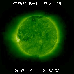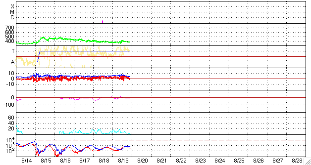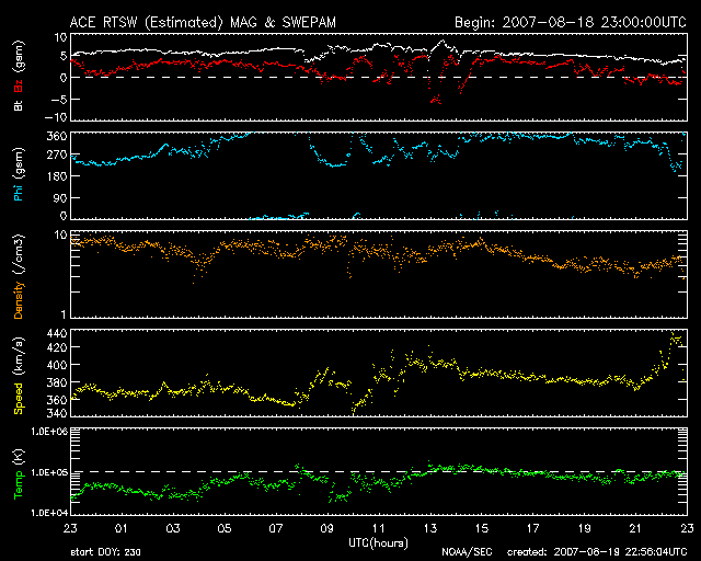 2007/ 8/20 07:57 更新 穏やかな太陽風が続いています。磁気圏も静穏です。 担当 篠原 太陽風は穏やかな状態が続いています。 速度は380km/秒でほぼ安定し、磁場強度も5nTと普段の強さです。 27日周期の図で前周期と今周期の様子を比較すると、 7月20-22日に見えていた高速風は、 規模が弱まり、期間が拡散したように見えます。 磁気圏も静穏な状態が続いています。 シベリアの磁場データはほぼ平坦です。 このまま22日まで、穏やかな太陽風が続くでしょう。 22日の夜か、23日に入った頃に、次の太陽風の乱れがやって来る可能性があります。 これは、7月26-27日の高速風の回帰ですが、 STEREOの画像を見ると、発生源のコロナホールがはっきりしなくなっています。 今回、高速風の規模が小さくなっているかもしれません。 前回も、1日程度の小規模の高速風でしたので、今回は更に弱まるのでしょうか。 更にその3日後には、次の高速風がやって来るでしょう。 そのコロナホールも、STEREOの写真に見えています。 太陽の東端(左端)に、横方向に長く伸びている影です。 もう1〜2日すると、よりはっきりとコロナホールの姿が見える様になるでしょう。 放射線帯の高エネルギー電子は、静穏なレベルで安定しています。 太陽のフレア活動は穏やかになりました。 黒点も見られません。 STEREO衛星紫外線望遠鏡EUVI195の太陽写真。20日7時(世界時19日22時) (c) NASA ![]() ACEが観測した太陽風の磁場(1番上の枠、白線は全体の強度、赤線は南北成分) および、太陽風の密度(3番目の橙線)、速度(4番目の黄線) (c) NOAA/SEC ![]() シベリアで観測された3日間の磁場データ 右側の3分の1が、昨日のデータになります。グラフが上がったり下がったりすると、オーロラ活動が活発化しています。 (c) NICT ![]() 27日の太陽周期に合わせたデータプロット 太陽が同じ面を地球に向けていた27日前の変化から、今後を予想することができます。 (c) NICT
