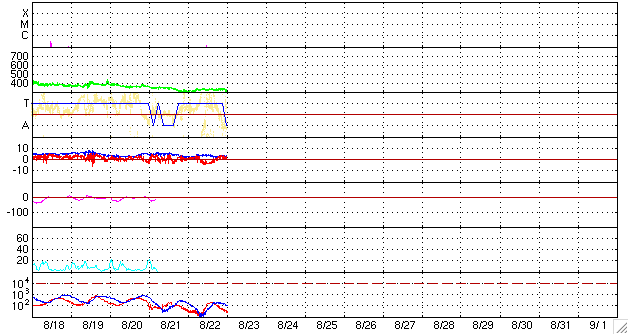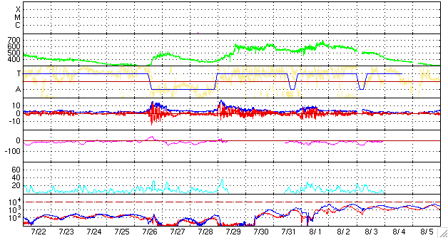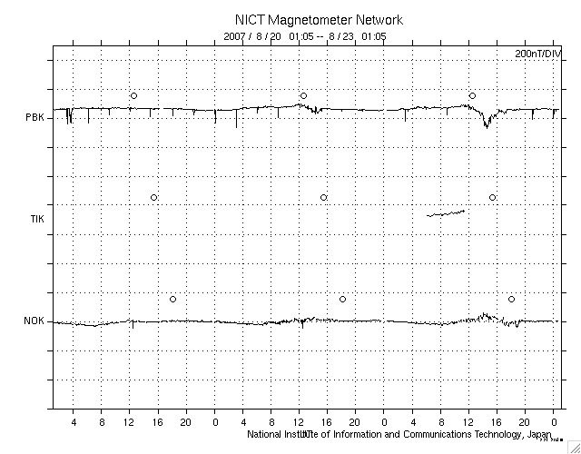 ACEが観測した太陽風の磁場(1番上の枠、白線は全体の強度、赤線は南北成分) および、太陽風の密度(3番目の橙線)、速度(4番目の黄線) (c) NOAA/SEC ![]() シベリアで観測された3日間の磁場データ 右側の3分の1が、昨日のデータになります。グラフが上がったり下がったりすると、オーロラ活動が活発化しています。 (c) NICT ![]() 27日の太陽周期に合わせたデータプロット 太陽が同じ面を地球に向けていた27日前の変化から、今後を予想することができます。 (c) NICT