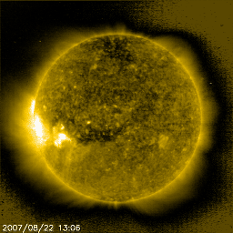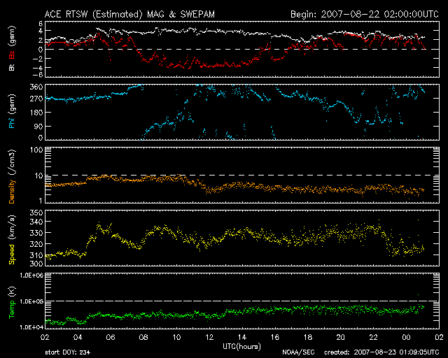 2007/ 8/23 10:10 更新 低速の太陽風が続いています。穏やかな状態が続きそうです。 担当 篠原 低速の太陽風が続いています。 速度は320km/秒前後で推移しています。 かなり低速のままです。 高速風の回帰が見られる可能性がありましたが、 来ないままとなりそうです。 コロナホールが弱まっていた通りだったと言えそうです。 ACEのグラフを見ると、昨日の夕方より、 -4nTの安定した南向きが7時間ほど続いていました。 磁気圏へ影響を及ぼしうる変化ですが、 なにしろ太陽風の速度がかなり下がっているので、 目立った磁気圏活動は発生していません。 AE指数では、200nTくらいの小さな変化が見られているだけです。 シベリア磁場データでも、小規模の変動が記録されているだけです。 今後の展開ですが、25日頃から高速の太陽風がやって来そうです。 SOHO EIT284の太陽写真で、コロナホールがちょうど太陽の中心に達しています。 昨夜の写真なので、その3日後で25日頃という見積もりです。 27日周期の図によると、前回は600km/秒の高速状態が4日程度続いています。 太陽黒点の写真は、昨日と同じままですが、 969黒点群が東の端に見えています。 今回の黒点も赤道の近くでした。 黒点の活動周期が極小を迎えると、黒点がより高い緯度で現れるようになります。 その時を待っているのですが、なかなかやって来ません。 黒点の規模は小さく、フレア活動は静穏です。 SOHO衛星のEIT284カメラの映像 (c) SOHO (ESA & NASA)