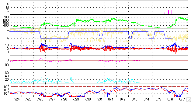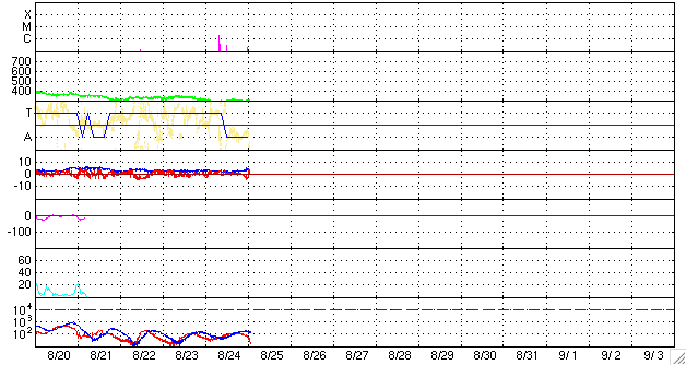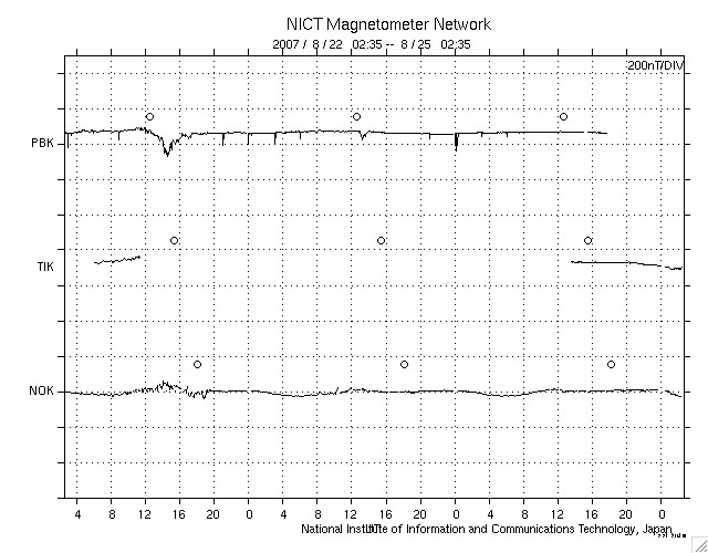 ACEが観測した太陽風の磁場(1番上の枠、白線は全体の強度、赤線は南北成分) および、太陽風の密度(3番目の橙線)、速度(4番目の黄線) (c) NOAA/SEC ![]() シベリアで観測された3日間の磁場データ 右側の3分の1が、昨日のデータになります。グラフが上がったり下がったりすると、オーロラ活動が活発化しています。 (c) NICT ![]() 27日の太陽周期に合わせたデータプロット 太陽が同じ面を地球に向けていた27日前の変化から、今後を予想することができます。 (c) NICT