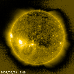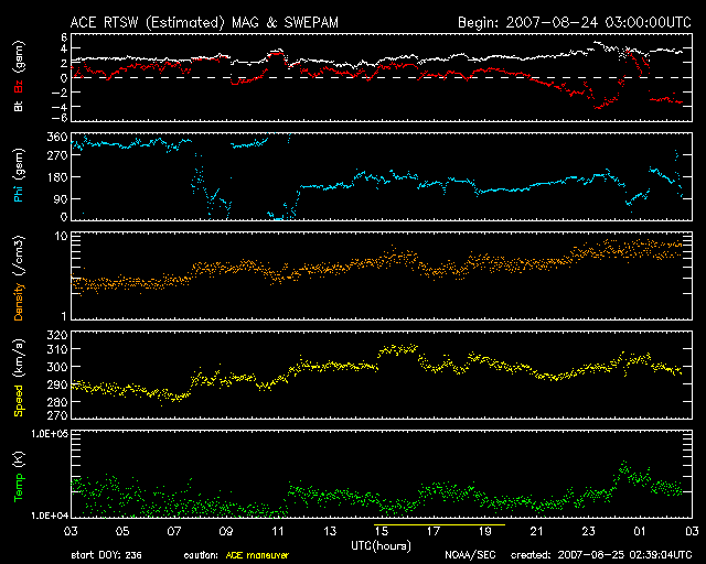 2007/ 8/25 11:40 更新 300km/秒と低速の太陽風が続いています。これから高速の太陽風がやって来るでしょう。 担当 篠原 たいへん低速の太陽風が続いています。 速度は300km/秒でほぼ安定しています。 このため、磁気圏もたいへん静かで、 シベリア磁場データ、AE指数には全く変化が見られません。 1週間以上にわたって、穏やかな状態が続いてます。 これから、高速の太陽風がやって来ると予想されます。 27日周期の図では、そろそろ始まってもいい頃ですが、 昨日のニュースで書いた様に、コロナホールの位置が変化しているので、 到来は、半日から1日程度遅れるかもしれません。 今後の太陽風の変化に注目してください。 現在、太陽風の密度(AECの図の橙色線)が、やや増加をしています。 高速風の始まりと関係しているのかもしれません。 高速風の到来では、太陽風磁場の強度が初めに強まります。 その時に、南向き磁場が強まると、磁気圏が活動的になるので注意して下さい。 今日のSOHO EIT284の写真では、 コロナホールは太陽の西側へと次第に移動しています。 太陽黒点の写真の更新が止まっています。 掲載の写真は22日のままです。 現在は、969黒点群はもう少し右へと移動しています。 規模は小さいままです。 ですが、Cクラスの小規模フレアを起こしました。 引き続きこの程度の小さな活動が続くかもしれません。 SOHO衛星のEIT284カメラの映像 (c) SOHO (ESA & NASA)