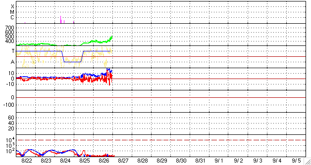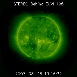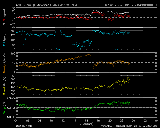 2007/ 8/27 12:34 更新 太陽風の速度が上がりました(500km/秒)。磁気圏もやや活動的になっています。 担当 篠原 太陽風の速度が上昇し、高速風に変わっています。 昨日以降、太陽風の速度(ACEの黄色線)は400km/秒で推移していました。 しかし、今朝になって、27日5時(世界時26日20時)頃から速度が上がり始め、 現在、500km/秒に達しています。 前周期の速度変化と比較すると、高速風の様子がだいぶ変わっている様です。 速度上昇に先立って、太陽風の密度(橙色線)の上昇と、 磁場強度(白線)の上昇も見られています。 密度は、一時、60個/cm^3まで上がりました。 また、磁場強度も20nTまで強まり、現在も13nTくらいに強まったままです。 磁場強度がまだ高いレベルにありますので、速度は引き続き上昇するかもしれません。 磁場強度と速度が変化したことで、磁気圏もやや活動的になっています。 シベリアの磁場データでは、一番下のNOKで中規模の変化が見られています。 速度が上がる前の、磁場強度が強まったことの影響の様です。 現在は、速度が上がり、磁場強度も強まったままなので、 磁気圏活動の活発な状態が続く可能性があります。 引き続き、注意してください。 高速風は3日程度続きそうに思われます。 今日もSTEREOの写真を掲載しています。 SOHOのEITカメラは観測休止の期間に入っています。 太陽コロナの写真を見ると、太陽の南東(左下)に次のコロナホールが見えています。 前周期と比較すると、やや西(右)にずれたような印象です。 27日周期の図で見ると、前周期の8月6日に始まった高速風の発生源ですが、 今回は到来が少し早まるかもしれません。 STEREO Behindのカメラでは、コロナホールの位置が、 SOHOで見るよりも1日くらい進んで見えますので、注意してください。 放射線帯の高エネルギー電子は、低いレベルに下がったままです。 現在の高速風の影響は、明日以降見えて来るでしょう。 太陽は969黒点群が見えるだけです。 黒点はやや小さくなったようです。 X線のグラフには全く変化は見られず、穏やかな太陽です。 STEREO衛星紫外線望遠鏡EUVI195の太陽写真。27日4時(世界時26日19時) (c) NASA ![]() ACEが観測した太陽風の磁場(1番上の枠、白線は全体の強度、赤線は南北成分) および、太陽風の密度(3番目の橙線)、速度(4番目の黄線) (c) NOAA/SEC ![]() シベリアで観測された3日間の磁場データ 右側の3分の1が、昨日のデータになります。グラフが上がったり下がったりすると、オーロラ活動が活発化しています。 (c) NICT ![]() 27日の太陽周期に合わせたデータプロット 太陽が同じ面を地球に向けていた27日前の変化から、今後を予想することができます。 (c) NICT