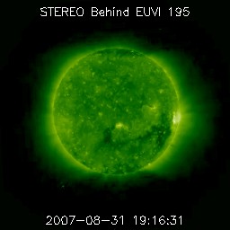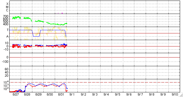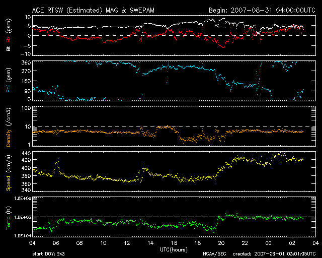 2007/ 9/ 1 12:02 更新 穏やかな太陽風が続いています。これから、高速風がやって来るでしょう。 担当 篠原 速度が400km/秒前後の穏やかな太陽風が続いています。 磁場強度も5nTで、普通の状態です。 磁気圏のオーロラ活動も概ね穏やかです。 太陽風磁場の南北成分が、多少南向きに振れたりしたので、 小規模の活動は見られています。 AE指数では300nTくらいの変化です。 シベリアの磁場データにも、小さな変化が見えています。 これから高速の太陽風がやって来ると予想していますが、 まだ、その気配はありません。 27日周期の図を見ると、前周期の8月6日、高速風が始まる前に、 太陽風磁場のセクターが、T(地球から太陽方向)から A(太陽から地球方向)に切り替わる変化が起こってます。 今回も、つい先ほど同じ変化が起こっています。 これから高速風領域に入って行くことになりそうです。 高速風の始まりでは、磁場強度が先に強まります。 その時に、南北成分が大きく南に振れる変化が起こりやすくなります。 そうなると、オーロラが活発になったり、磁気嵐が発生しやすくなります。 高速風の到来では、前半により注意が必要です。 9月に入り、北極の空にも夜が戻って来ました。 ライブカメラでアラスカのオーロラを楽しめる季節にもなっています。 放射線帯の高エネルギー電子は、数が大きく減っています。 これから来る、高速風の後半から注意が必要になります。 太陽では、969黒点群が少し大きくなっている様です。 南側(下側)に新しく、小さな点が増えています。 それと関係しているのでしょうか、X線のグラフもざわついた様になり、 Bクラスの小さなフレアが起きています。 ただ、黒点群の規模は小さいですので、小さな活動が見られる程度でしょう。 STEREO衛星紫外線望遠鏡EUVI195の太陽写真。9月1日4時(世界時8月31日19時) (c) NASA ![]() ACEが観測した太陽風の磁場(1番上の枠、白線は全体の強度、赤線は南北成分) および、太陽風の密度(3番目の橙線)、速度(4番目の黄線) (c) NOAA/SEC ![]() シベリアで観測された3日間の磁場データ 右側の3分の1が、昨日のデータになります。グラフが上がったり下がったりすると、オーロラ活動が活発化しています。 (c) NICT ![]() 27日の太陽周期に合わせたデータプロット 太陽が同じ面を地球に向けていた27日前の変化から、今後を予想することができます。 (c) NICT