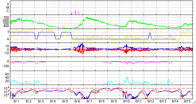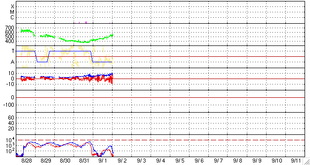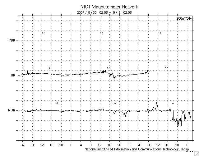 ACEが観測した太陽風の磁場(1番上の枠、白線は全体の強度、赤線は南北成分) および、太陽風の密度(3番目の橙線)、速度(4番目の黄線) (c) NOAA/SEC ![]() シベリアで観測された3日間の磁場データ 右側の3分の1が、昨日のデータになります。グラフが上がったり下がったりすると、オーロラ活動が活発化しています。 (c) NICT ![]() 27日の太陽周期に合わせたデータプロット 太陽が同じ面を地球に向けていた27日前の変化から、今後を予想することができます。 (c) NICT