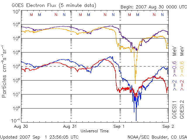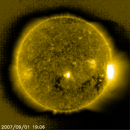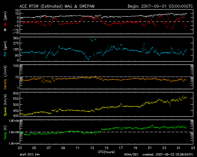 2007/ 9/ 2 11:09 更新 太陽風の速度がゆっくりと上昇し、高速風になっています。オーロラも活発化しつつあります。 担当 篠原 ゆっくりと太陽風の速度が上がっています。 昨日の420km/秒から一本調子で上がり続け、現在550km/秒に達しています。 太陽風の磁場強度も、速度が上がるとともに5nTから9nTに強まりました。 現在も強いままですので、速度が更に上がるのではないかと思います。 速度が上がり、磁気圏の活動も活発化しています。 シベリアの磁場データを見ると、中規模のオーロラ活動が発生しています。 ACEの最後の部分を見ると、南北成分が大きく南北に振れる変化をしています。 速度が高まっていることもあり、これからオーロラ活動が激しくなるかもしれません。 ここまでの速度と磁場強度の様子から、 高速太陽風の本体はこれからやって来るのだろうと思います。 前周期同様、これから600km/秒を超える高速風になりそうです。 SOHO EIT284の写真では、 コロナホールが太陽の西端(右端)から、延々と中央部まで伸びています。 速度が上がったり下がったりしながら、 太陽風は1週間近くにわたって乱れた状態が続くと予想されます。 その間は、活発なオーロラ活動も期待されます。 放射線帯の高エネルギー電子は、レベルを更に下げています。 今後、上昇に転じると思われますので、以後の変化に注意してください。 太陽では、970黒点群が新しく発生しています。 太陽の中心付近で、EIT284の写真で明るく見えている場所です。 小さな黒点群です。 X線のグラフは、小さな変化が見られていますが、強度はたいへん小さいです。 太陽は穏やかな状態が続くでしょう。 SOHO衛星のEIT284カメラの映像 (c) SOHO (ESA & NASA)