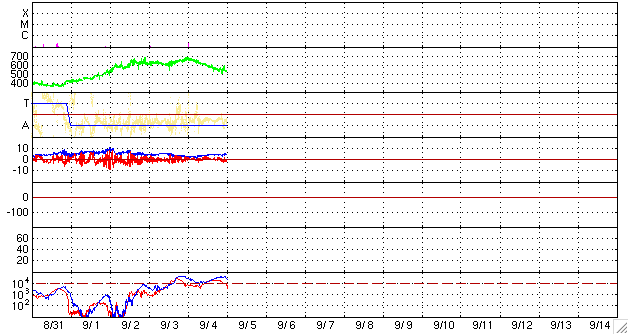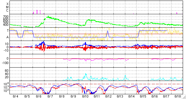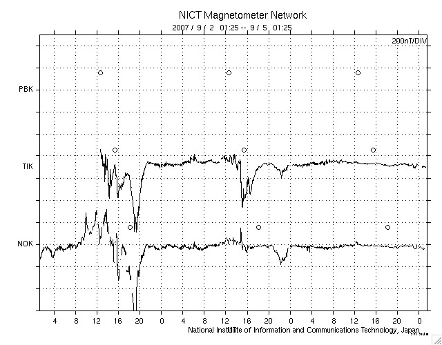 ACEが観測した太陽風の磁場(1番上の枠、白線は全体の強度、赤線は南北成分) および、太陽風の密度(3番目の橙線)、速度(4番目の黄線) (c) NOAA/SEC ![]() シベリアで観測された3日間の磁場データ 右側の3分の1が、昨日のデータになります。グラフが上がったり下がったりすると、オーロラ活動が活発化しています。 (c) NICT ![]() 27日の太陽周期に合わせたデータプロット 太陽が同じ面を地球に向けていた27日前の変化から、今後を予想することができます。 (c) NICT