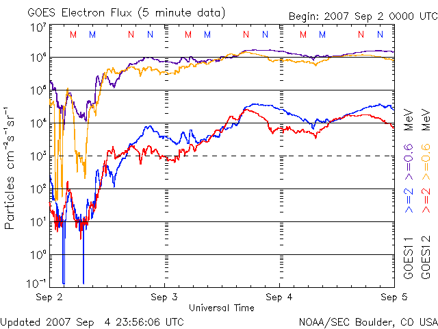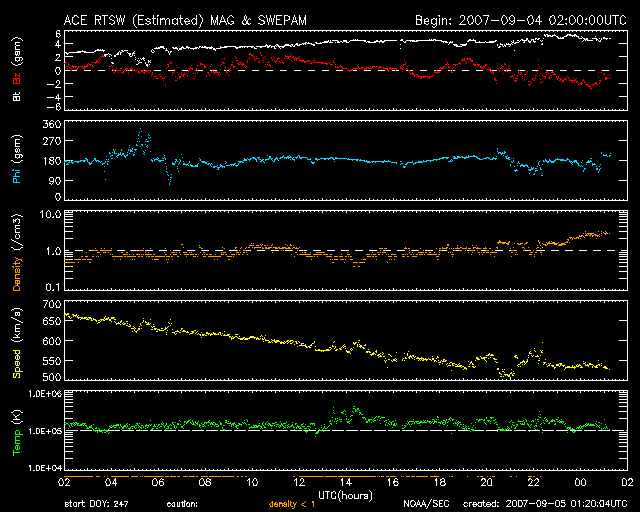 2007/ 9/ 5 10:21 更新 やや速度が下がりましたが(550km/秒)、高速の太陽風が続いています。 担当 篠原 高速の太陽風が続いています。 速度の変化としてはひとつめの山を越え、 650km/秒からゆっくりと下がって、現在は550km/秒になっています。 この間、太陽風磁場の南北成分はもっぱら北寄りで推移していました。 そのため、オーロラの活動はだいぶ弱まっています。 AE指数では、500nTの中規模活動が一度見られた程度で、その他の時間帯は静穏でした。 その様子は、シベリア磁場データでも見られ、 観測点の時間帯の関係もあって、こちらは1日を通して平坦なグラフになっています。 現在のACEのデータを見ると、磁場強度が5nTへやや上がっています。 小さな変化なのですが、これから速度がもう一度上がるのかもしれません。 今回の高速風は、東西に長く広がったコロナホールからやってきています。 途中、速度の増減が何度か見られる可能性があります。 そういった点も含めて、今後の太陽風の変化に注目してください。 SOHO EIT284の写真では、コロナホールの最期の部分が、 太陽の西寄りに移動しています。 この部分の影響が明日にはやってくるでしょう。 (現在の太陽風の変化の兆しは、こことつながっているのかもしれません) 27日周期の図で、8月10日に見えている変化の回帰です。 600km/秒程度まで、再び速度が上がることになるでしょう。 放射線帯の高エネルギー電子は、目立った増加は止まっています。 そして、2つの衛星とも警戒レベルで推移しています。 衛星の運用などでは、注意が必要です。 通常の状態では、放射線帯の高エネルギー電子の減衰はとてもゆっくりです。 ですが、今回は、この後に太陽風の乱れがまたやってくると思います。 その場合、高エネルギー電子は一度大きく数を減らすことになるでしょう。 そして、その後再び増加に転じます。 太陽のフレア活動は穏やかです。 970黒点群は小さいままです。 SOHO衛星のEIT284カメラの映像 (c) SOHO (ESA & NASA)