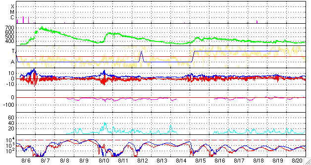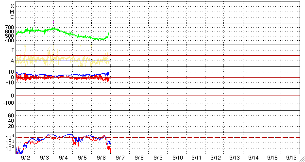 ACEが観測した太陽風の磁場(1番上の枠、白線は全体の強度、赤線は南北成分) および、太陽風の密度(3番目の橙線)、速度(4番目の黄線) (c) NOAA/SEC ![]() シベリアで観測された3日間の磁場データ 右側の3分の1が、昨日のデータになります。グラフが上がったり下がったりすると、オーロラ活動が活発化しています。 (c) NICT ![]() 27日の太陽周期に合わせたデータプロット 太陽が同じ面を地球に向けていた27日前の変化から、今後を予想することができます。 (c) NICT