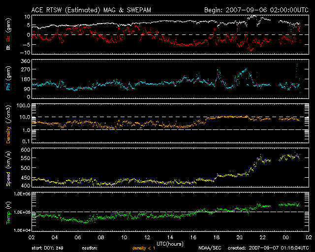 2007/ 9/ 7 10:17 更新 太陽風の速度が再上昇して、高速風になっています。オーロラも活動的です。 担当 篠原 今朝になって、太陽風の速度が上昇を始めました。 太陽風は、速度が420km/秒くらいまで下がっていましたが、 現在は、550km/秒まで上昇しています。 高速風がやってくるのが、思ったよりも遅かったという印象です。 SOHO EIT284の太陽写真(左の写真)では、 コロナホールは影響開始の目安の位置を大きく通り過ぎて、 コロナホールそのものがほとんど見えなくなっていますし、 27日周期の図で見ても、前回よりも半日程度遅れて回帰しています。 今回の高速風は、それほど大きなものにはならないでしょう。 磁場強度と密度がまだ下がっていないので、 速度としてはもうしばらく上がるかもしれませんが、 継続期間はそれほどでもなく、明日にはもう下がり始めるだろうと思います。 速度が上がる頃から、太陽風磁場が南寄りになり、 -5nTくらいの南向きが続いています。 このため、500〜1000nTくらいの中規模のオーロラ活動が断続的に発生しています。 シベリアの磁場データもにぎやかに変化しています。 南北成分の南寄り傾向が続く間は、引き続き活発なオーロラが期待できます。 今後の予想ですが、SOHO EIT284を見ると、 太陽は全体的にのっぺりとしていて、 黒点もコロナホールも見られない状態になっています。 現在の高速風が終わると、 かなり長い期間(2週間程度)たいへん穏やかな状態が続きそうです。 27日周期の図を見ると、前周期の8月15日に小さな太陽風の乱れが来ていました。 この頃の、SOHO EIT284の写真を見てください(右の写真)。 太陽の南東(左下)に、小さなコロナホールが見えています。 このコロナホールが、8月15日以降の乱れの原因です。 しかし、現在の太陽(左の写真)には、コロナホールが全くなくなっています。 8月15日の高速風は、6月以降次第に弱まる傾向が見られました。 今周期は、もうほとんど影響がないのかもしれません。 現在、太陽活動は極小を迎えていますが、 高速風の周期性にも大きな変化が見られているように感じます。 放射線帯の高エネルギー電子は、磁気圏活動によって大きく数を減らしています。 この後、再上昇すると思いますが、警戒レベルまで上がるかどうかは分かりません。 今後の変化に注目してください。 太陽のフレア活動はとても穏やかです。 970黒点群は、西側に没しつつあります。 SOHO衛星のEIT284カメラの映像 (c) SOHO (ESA & NASA)