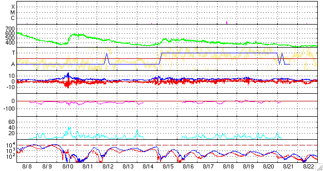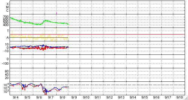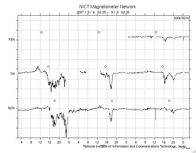 ACEが観測した太陽風の磁場(1番上の枠、白線は全体の強度、赤線は南北成分) および、太陽風の密度(3番目の橙線)、速度(4番目の黄線) (c) NOAA/SEC ![]() シベリアで観測された3日間の磁場データ 右側の3分の1が、昨日のデータになります。グラフが上がったり下がったりすると、オーロラ活動が活発化しています。 (c) NICT ![]() 27日の太陽周期に合わせたデータプロット 太陽が同じ面を地球に向けていた27日前の変化から、今後を予想することができます。 (c) NICT