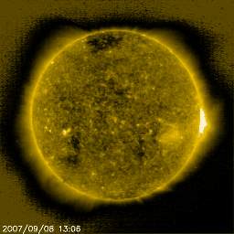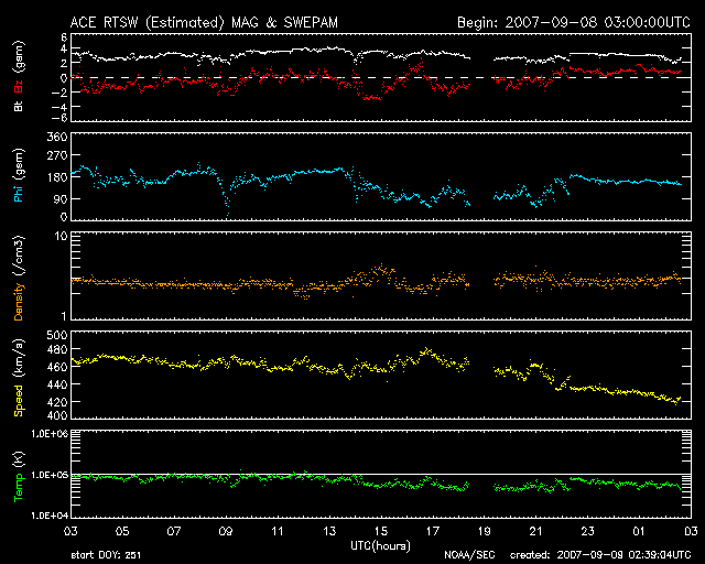 2007/ 9/ 9 11:40 更新 太陽風は通常の速度に戻りました。太陽は無黒点です。 担当 篠原 太陽風は、ゆっくりと速度が低下し、420km/秒と通常の速度に戻りました。 27日周期の図を見ると、前周期の変化(8月10-12日)とよく似た高速風でした。 速度が下がったので、オーロラ活動も次第に穏やかになっています。 シベリア磁場データでは、小規模の変化が見えていますが、 これは、ACEの図のまん中あたりで 磁場の南向きが一時的に強まったことに対応しています。 オーロラの活動には、太陽風の速度が高いことと、磁場が南を向くことと、 ふたつの要素があるのです。 これからしばらく、たいへん穏やかな宇宙天気が続くでしょう。 SOHO EIT284では、太陽の南東(左下)に小さなコロナホールが見えています。 この領域が地球に影響を及ぼすのは、5〜6日後くらいになりそうです。 放射線帯の高エネルギー電子は、やや増加しています。 しかし、増加はここまでで、警戒レベルに達することはないでしょう。 太陽は無黒点です。 フレア活動はとても穏やかです。 SOHO衛星のEIT284カメラの映像 (c) SOHO (ESA & NASA)