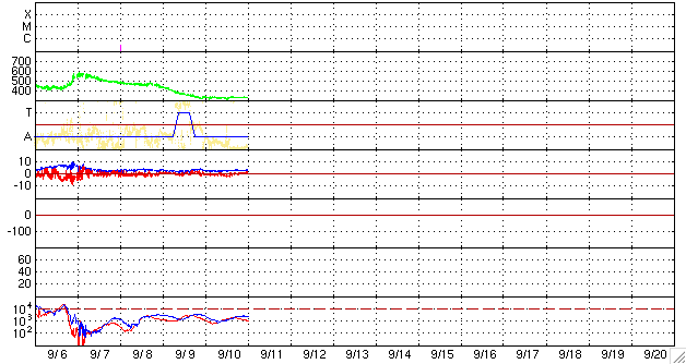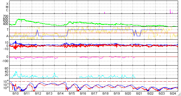 ACEが観測した太陽風の磁場(1番上の枠、白線は全体の強度、赤線は南北成分) および、太陽風の密度(3番目の橙線)、速度(4番目の黄線) (c) NOAA/SEC ![]() シベリアで観測された3日間の磁場データ 右側の3分の1が、昨日のデータになります。グラフが上がったり下がったりすると、オーロラ活動が活発化しています。 (c) NICT ![]() 27日の太陽周期に合わせたデータプロット 太陽が同じ面を地球に向けていた27日前の変化から、今後を予想することができます。 (c) NICT