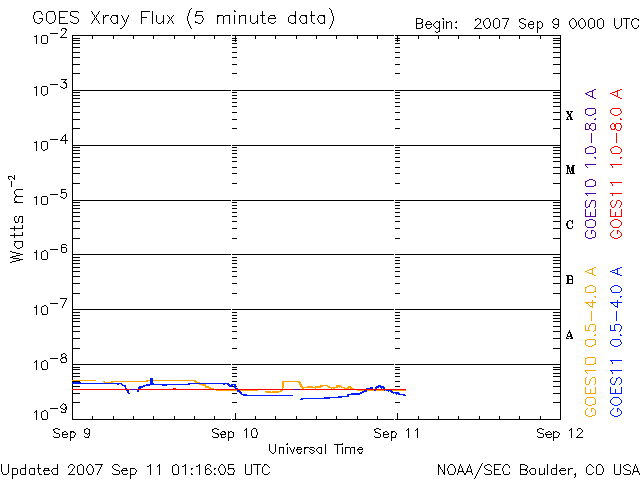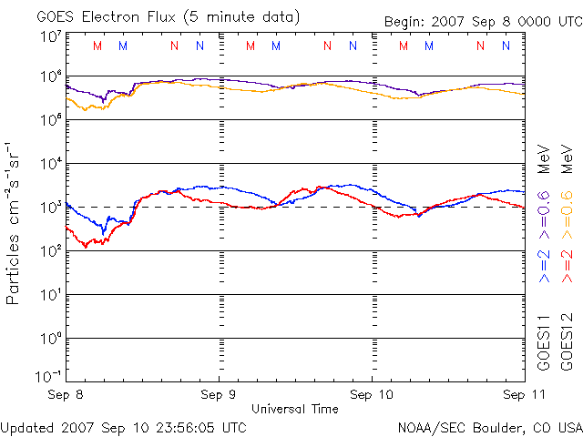 (c) SOHO (ESA & NASA) ![]() GOES衛星の太陽X線データ (c) NOAA/SEC ![]() GOES衛星による、静止衛星軌道における高エネルギー電子の変化 (c) NOAA/SEC ![]() | |||||||||||||||||||||||||||||||||||||||||||||||||||||||||||||||