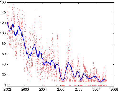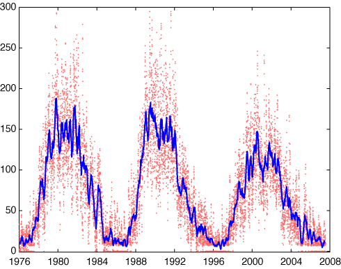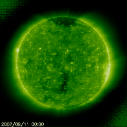 2007/ 9/11 10:21 更新 太陽風は低速で、宇宙天気は穏やかです。黒点の長期変化を紹介します。 担当 篠原 ある研究会の資料として黒点相対数の長期変化の図を作成しましたので、紹介します。 1枚めは11年周期3回分の長期変化の図。 2枚めは、2002年以降の黒点相対数が下がり続けている部分の拡大です。 太陽の黒点は約11年の周期で、増えたり、減ったりします。 その様子は、1枚めの図でよく分かります。 1日の黒点相対数で言うと、最盛期は300という様なレベルに達しますが、 現在は、30以下のとても小さな値です(0も珍しくありません)。 2003年以降、黒点相対数は減少を続けています。 2枚めの図を見ると、2002年の後半からぐんぐん下がっています。 昨年、2006年頃に底に達したかとも思ったのですが、 今年に入って、更に下のレベルに下がっています。 この底の部分がどこまで続くのか、現在、興味を持って観察が続けられているところです。 黒点が減ると、フレアなどの太陽活動は弱まり、宇宙天気は基本的に穏やかになります。 宇宙天気ニュースでも大きな話題が少なくなったのは、このためです。 今年のうちか、2008年に入ってかはまだ分かりませんが、 やがて太陽活動は次の周期に入り、黒点の数も増加に転じます。 その兆しは、太陽黒点が出現する緯度や、磁場のパターンなどで知ることができます。 これから半年、1年という長い目が必要ですが、 太陽と宇宙天気の変化をゆっくりと追いかけてください。 現在の宇宙天気はとても穏やかです。 太陽風の速度は330km/秒と低く、低速状態です。 磁場強度も3nTと弱まっています。 このため、磁気圏はとても穏やかです。 シベリア磁場データには、何の変化も見られません。 この穏やかな状態は、14日くらいまで続くと思います。 コロナホールがちょうど太陽の中心に達しています。 中心部に来ると、小さいながらも、濃くはっきりと姿を見せています。 太陽風は、速度としてはそれなりに高まるかもしれません。 太陽は無黒点のままです。 フレア活動はなく、とても穏やかです。 黒点相対数の長期変化。赤点は1日ごとの値。青線は3ヶ月平均値。極小へ達しつつあります。 (c) 宇宙天気ニュース (篠原)、黒点データはNOAAより ![]() 極小へ向かって黒点相対数が減少を続けている様子。赤点は1日ごとの値。青線は3ヶ月平均値。 (c) 宇宙天気ニュース (篠原)、黒点データはNOAAより ![]() SOHO衛星のEIT195カメラの映像 (c) SOHO (ESA & NASA)