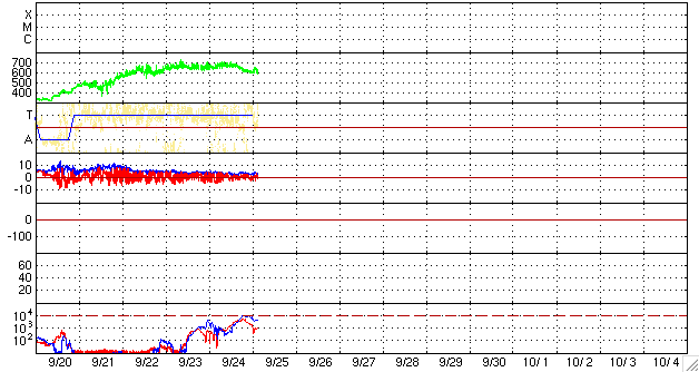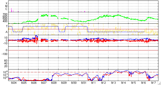 ACEが観測した太陽風の磁場(1番上の枠、白線は全体の強度、赤線は南北成分) および、太陽風の密度(3番目の橙線)、速度(4番目の黄線) (c) NOAA/SEC ![]() シベリアで観測された3日間の磁場データ 右側の3分の1が、昨日のデータになります。グラフが上がったり下がったりすると、オーロラ活動が活発化しています。 (c) NICT ![]() 27日の太陽周期に合わせたデータプロット 太陽が同じ面を地球に向けていた27日前の変化から、今後を予想することができます。 (c) NICT