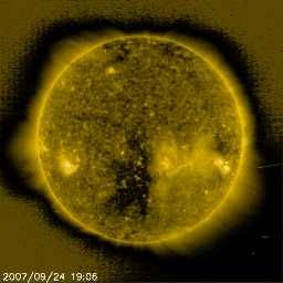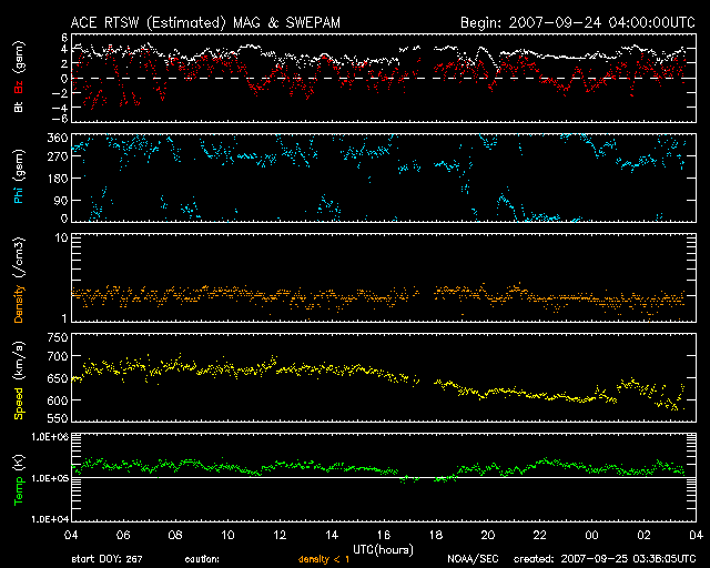 2007/ 9/25 12:39 更新 高速太陽風は速度が下がり始めました。そして、次のコロナホールが来ています。 担当 篠原 高速の太陽風が続いています。 しかし、速度は下がり始めており、高速風は後半に入っています。 昨日も太陽風は、650km/秒を超えるかなり高い速度を保っていました。 一方、磁場強度はゆっくりと弱まり、3nTくらいに下がりました。 これは、太陽風の速度が下がり始める目安になります。 そして、今日に入った頃から速度が低下を始めました。 現在、ちょうど600km/秒を割ったところです。 まだまだ速度としては高いですが、 これから時間とともにゆっくりと下がって行くでしょう。 明後日には、一旦、通常の速度にもどると思います。 太陽風の速度はかなり速かったのですが、 磁気圏のオーロラ活動は、比較的低調でした。 AE指数では、500nT前後のやや小さめの変動が2回ほど見られただけで、 それほど荒れていません。 シベリアの磁場データも日を追うごとに変化が小さくなっています。 これは、太陽風磁場の南北成分が、あまり南を向かなかったためです。 磁場強度は既に弱まり、速度も下がり始めたことから、 今後は一段と穏やかになっていくでしょう。 そして、SOHO EIT284では、太陽の南側(下側)に大きなコロナホールが見えています。 かなり大きな見え方をしています。 前周期のEIT284の写真がないので、比較が難しいのですが、 恐らく規模は拡大していると思います。 右端がちょうど太陽の中心線に達しているので、 3日後の28日くらいに次の高速風が始まるでしょう。 今度の高速風もまた、前周期(9月2-4日)を上回る規模になる可能性があります。 放射線帯の高エネルギー電子が更に増加して、GOES11(青線)が警戒レベルに達しました。 高速風は後半を迎えていますが、こちらはもう少し上昇して、 2衛星とも10,000のレベルに達するかもしれません。 太陽は無黒点で、たいへん穏やかです。 黒点が最後に見えていたのは、9月7日のことです。 それから2週間以上、黒点が見えない状態が続いています。 SOHO衛星のEIT284カメラの映像 (c) SOHO (ESA & NASA)