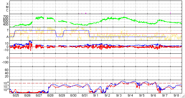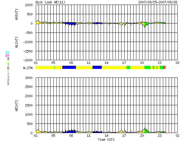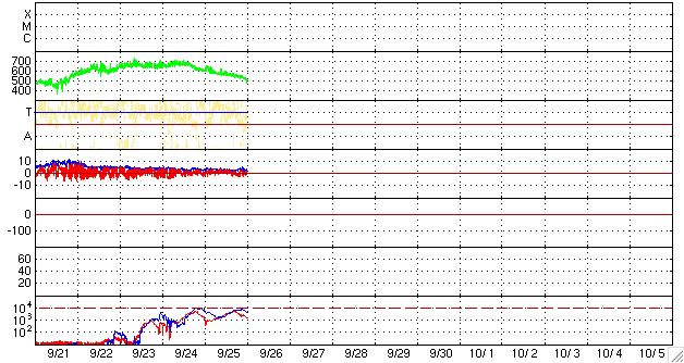 ACEが観測した太陽風の磁場(1番上の枠、白線は全体の強度、赤線は南北成分) および、太陽風の密度(3番目の橙線)、速度(4番目の黄線) (c) NOAA/SEC ![]() シベリアで観測された3日間の磁場データ 右側の3分の1が、昨日のデータになります。グラフが上がったり下がったりすると、オーロラ活動が活発化しています。 (c) NICT ![]() リアルタイムAE指数 下段のAEグラフの値が高くなると、オーロラ活動が活発化しています。 (c) 京都大学, NICT ![]() 27日の太陽周期に合わせたデータプロット 太陽が同じ面を地球に向けていた27日前の変化から、今後を予想することができます。 (c) NICT
