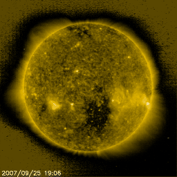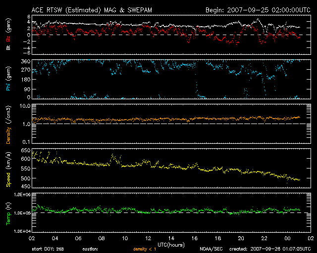 2007/ 9/26 10:08 更新 高速太陽風は終盤を迎えています(500km/秒)。 担当 篠原 高速太陽風は終盤を迎えています。 太陽風の速度はゆっくりと低下を続け、500km/秒を割りました。 磁場強度も3nT弱くらいに弱まっていて、太陽風は次第に穏やかになっています。 磁気圏のオーロラ活動もだいぶ静かになっています。 シベリア磁場データでは、変化がひとつ見えていますが、 昨日の目立った変動はこれひとつで、AE指数でも小規模の変化でした。 これから太陽風の速度は更に下がり、 明日には、静穏レベルへ戻っているでしょう。 磁気圏も一旦穏やかになります。 その一方、コロナホールが太陽の中心を通過しつつあります。 現在、このコロナの穴から、 速度の高い太陽風が地球へ向かって放出されているところです。 到来には3日ほどかかります。 高速風の先頭が地球にやってくるのは、 明後日、28日くらいだろうと予想しています。 前周期では、最高速度は650km/秒に達し、高速風は4日ほど続きました。 放射線帯高エネルギー電子の増加は止まっています。 警戒レベルをやや下回るところで落ち着いています。 今回の増加はここまででしょう。 太陽は無黒点で、フレア活動はたいへん穏やかです。 SOHO衛星のEIT284カメラの映像 (c) SOHO (ESA & NASA)