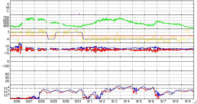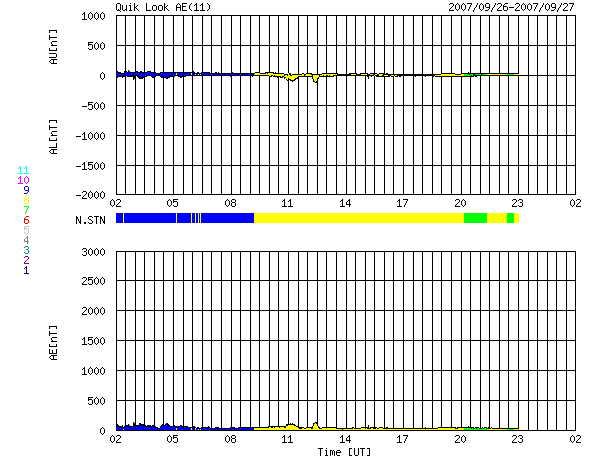 ACEが観測した太陽風の磁場(1番上の枠、白線は全体の強度、赤線は南北成分) および、太陽風の密度(3番目の橙線)、速度(4番目の黄線) (c) NOAA/SEC ![]() シベリアで観測された3日間の磁場データ 右側の3分の1が、昨日のデータになります。グラフが上がったり下がったりすると、オーロラ活動が活発化しています。 (c) NICT ![]() リアルタイムAE指数 下段のAEグラフの値が高くなると、オーロラ活動が活発化しています。 (c) 京都大学, NICT ![]() 27日の太陽周期に合わせたデータプロット 太陽が同じ面を地球に向けていた27日前の変化から、今後を予想することができます。 (c) NICT