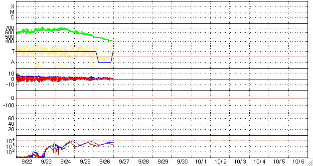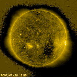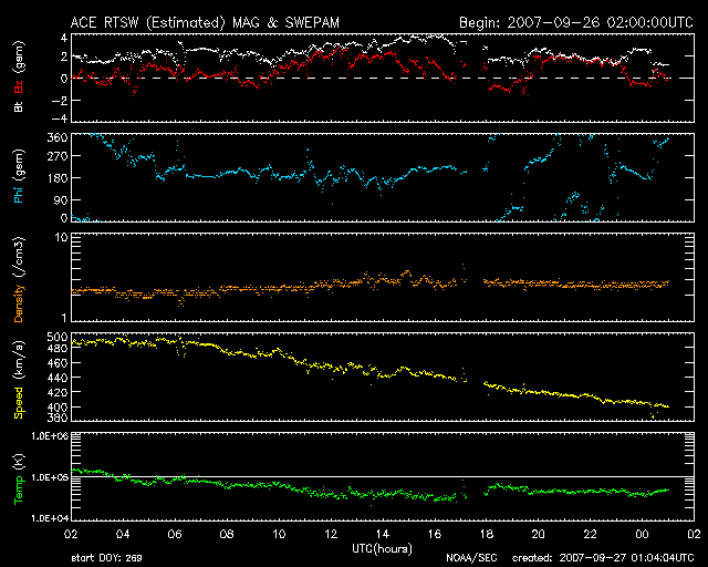 2007/ 9/27 10:05 更新 太陽風は通常の速度に戻りました。明日くらいから高速の太陽風がやって来るでしょう。 担当 篠原 昨日より太陽風の速度はずっと下がり続けて、 今朝は、400km/秒と普通の速度に戻っています。 磁場強度も2nTと弱まっていて、穏やかな太陽風です。 太陽風自体が穏やかになってきたことに加え、 磁場の南北成分が北寄りに推移しているので、 磁気圏のオーロラ活動はほとんど見られなくなっています。 シベリアの磁場データはすっかり平らになっています。 また、AE指数も、ごく小さな変化が見える程度です。 今日一日は、このまま穏やかな状態が続くと思います。 そして、明日以降、次の高速太陽風が地球へやってきます。 発生源のコロナホールは、太陽の南西に移動し、 地球へ影響が及び始める目安の位置に達しつつあります。 (太陽の中心と、西端の中間くらいが目安の位置です) 27日周期の図を見ると、 これは、9月1日に始まった高速風が回帰してくるものです。 前回は、最高速度は650km/秒に達し、4日ほど高速状態が続きました。 高速風の立ち上がりでは、オーロラ活動など磁気圏の擾乱が発生しやすくなります。 明日から明後日にかけて、太陽風に注意が必要です。 放射線帯高エネルギー電子は、やや高めの状態が続いていますが、 警戒レベルは下回っています。 次の高速風の到来で一旦大きく下げ、その後再び上昇すると思われます。 土曜日以降、注意が必要となります。 太陽のフレア活動はたいへん穏やかです。 黒点は見られず、SOHO EIT284を見ても、新しい黒点がやってくる気配はありません。 こちらはずっと静かです。 SOHO衛星のEIT284カメラの映像 (c) SOHO (ESA & NASA)