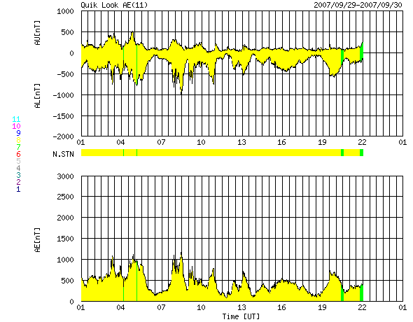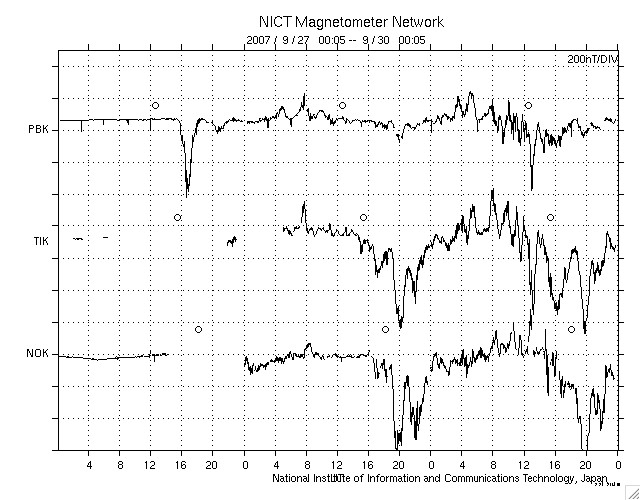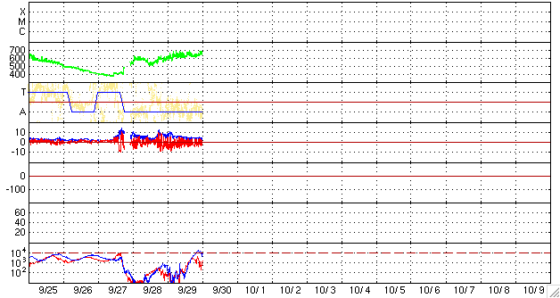 ACEが観測した太陽風の磁場(1番上の枠、白線は全体の強度、赤線は南北成分) および、太陽風の密度(3番目の橙線)、速度(4番目の黄線) (c) NOAA/SEC ![]() リアルタイムAE指数 下段のAEグラフの値が高くなると、オーロラ活動が活発化しています。 (c) 京都大学, NICT ![]() シベリアで観測された3日間の磁場データ 右側の3分の1が、昨日のデータになります。グラフが上がったり下がったりすると、オーロラ活動が活発化しています。 (c) NICT ![]() 27日の太陽周期に合わせたデータプロット 太陽が同じ面を地球に向けていた27日前の変化から、今後を予想することができます。 (c) NICT